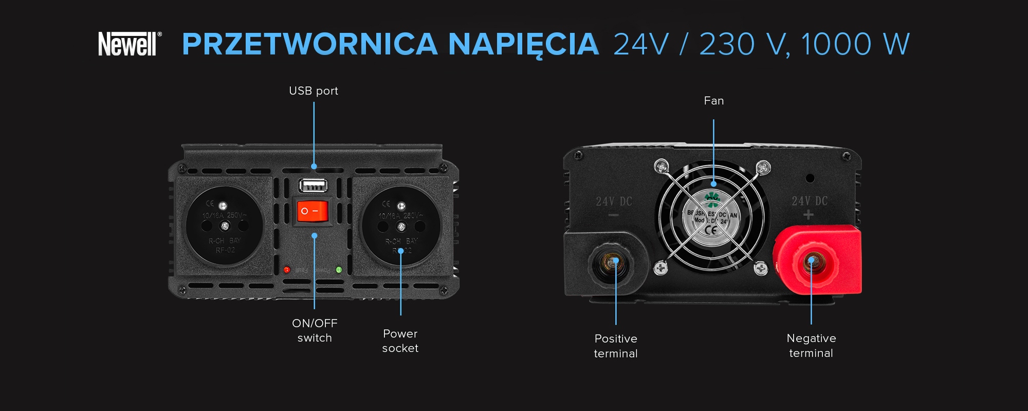 - модель : преобразователь напряжения Newell с модифицированной синусоидой - 24 В/230 В, 1000 Вт.