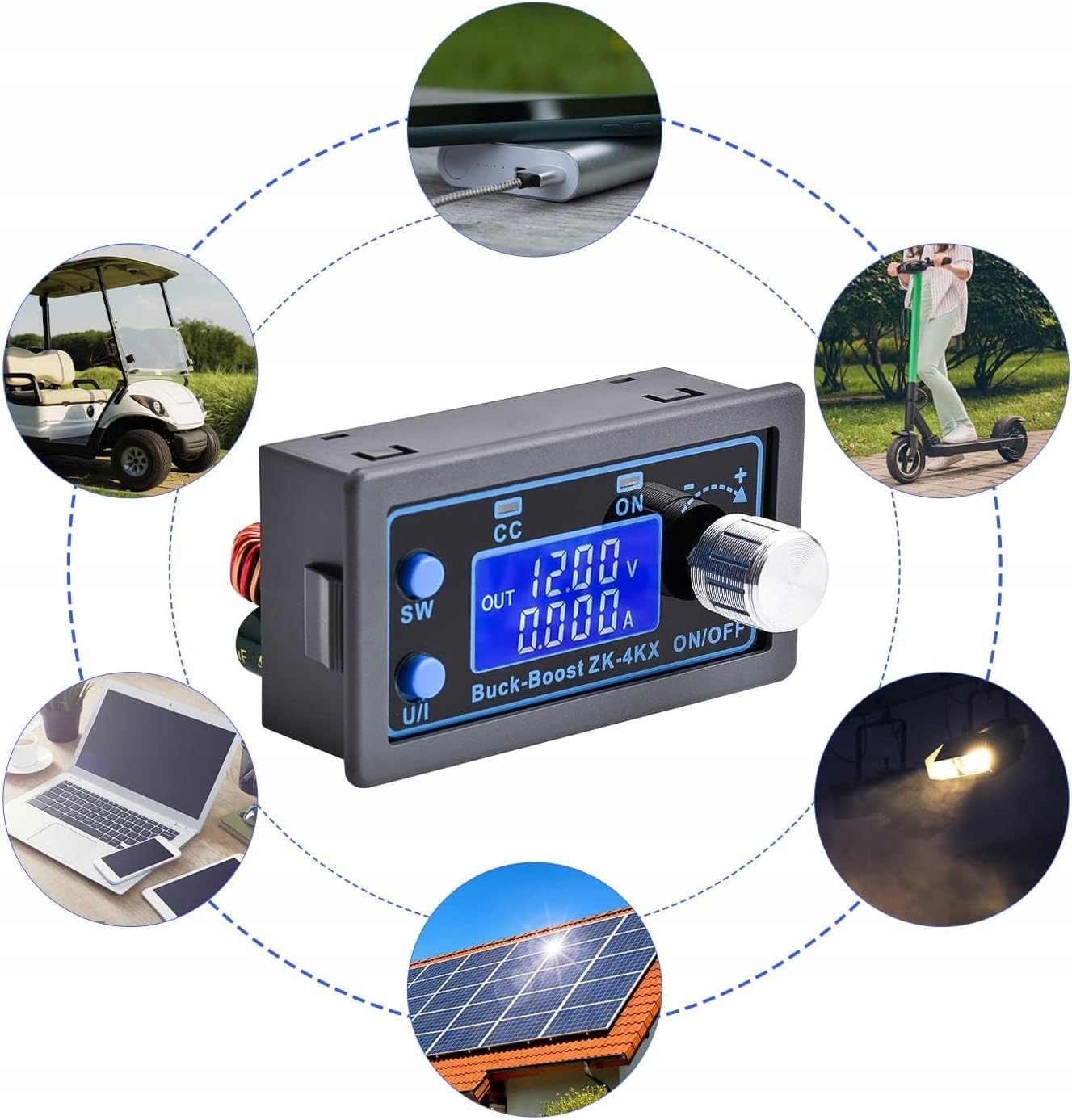 Эту плату преобразователя напряжения можно использовать как стандартный повышающий/понижающий модуль с защитой от перегрузки по току; также может использоваться в качестве модуля формирователя постоянного тока для мощных светодиодов; также может использоваться в автономных солнечных контроллерах и зарядных устройствах.