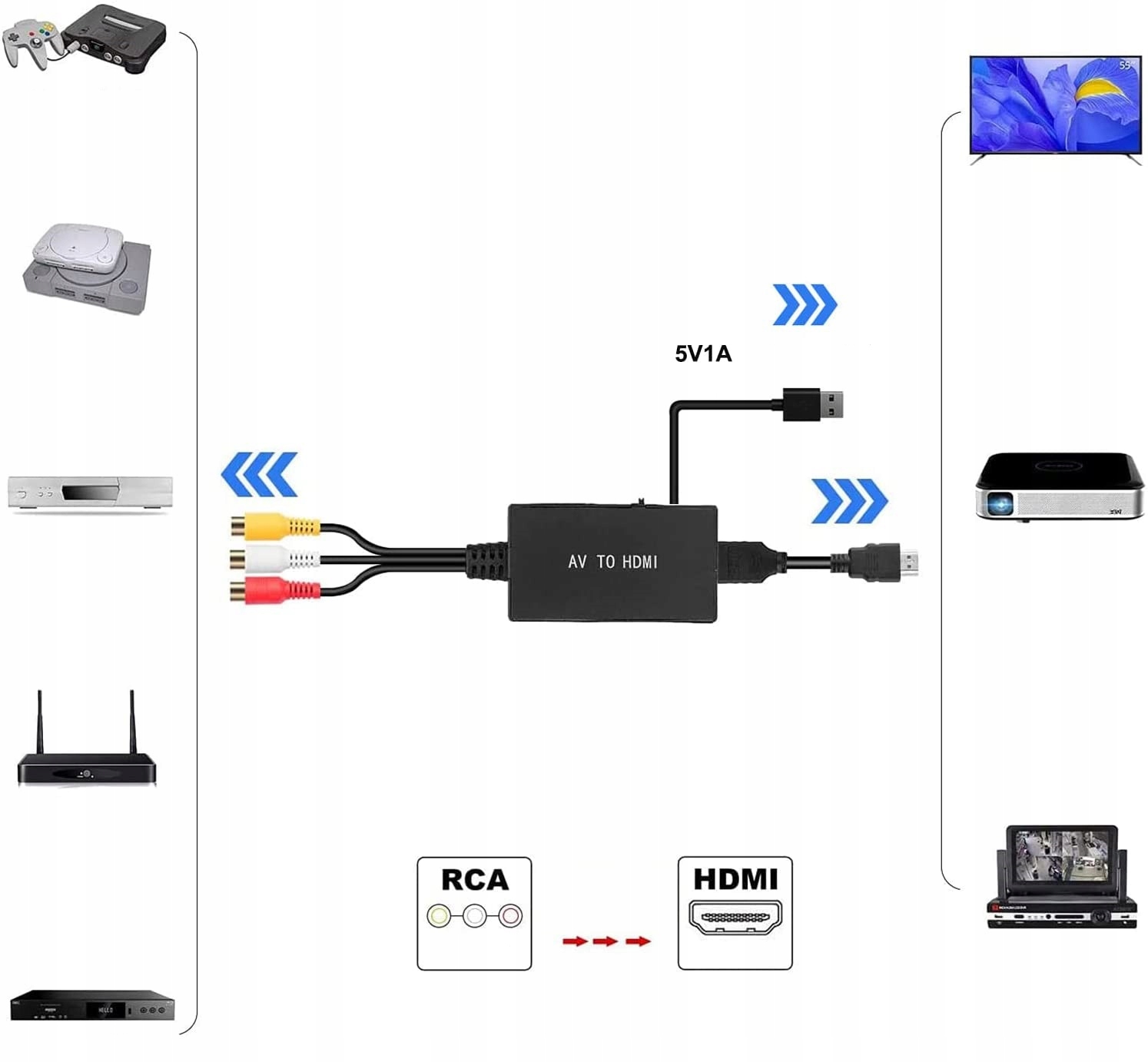 Идеально подходит для подключения старых AV-устройств, таких как DVD-плееры, VHS-плееры, игровые консоли, камеры или видеомагнитофоны, к современным телевизорам, мониторам и проекторам с портами HDMI. С помощью этого конвертера вы сможете оживить свои старые медиафайлы, смотреть фильмы и играть в классические игры на большом экране в качестве Full HD.