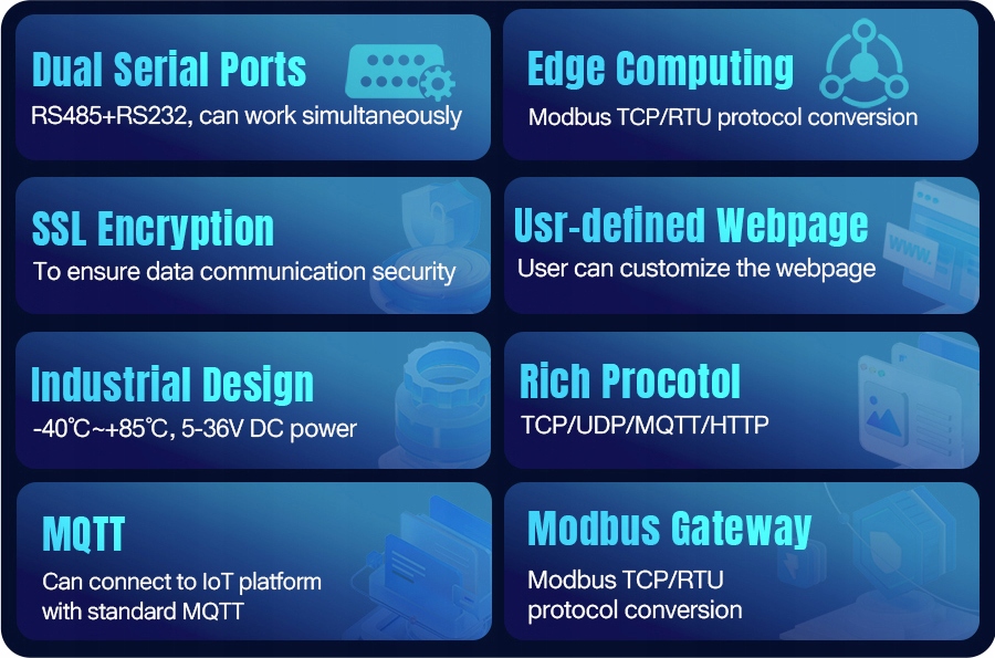 USR-TCP232-410s H7 EDGE — это сервер последовательных устройств с двумя портами, который позволяет подключать устройства 1×RS232 и 1×RS485 к сети TCP/IP. Он поддерживает двустороннюю связь, преобразование протокола Modbus RTU/TCP, периферийные вычисления и другие расширенные функции. Устройство построено на базе ядра Cortex-M7 с частотой до 400 МГц, что обеспечивает высокую скорость обработки и стабильную передачу данных.