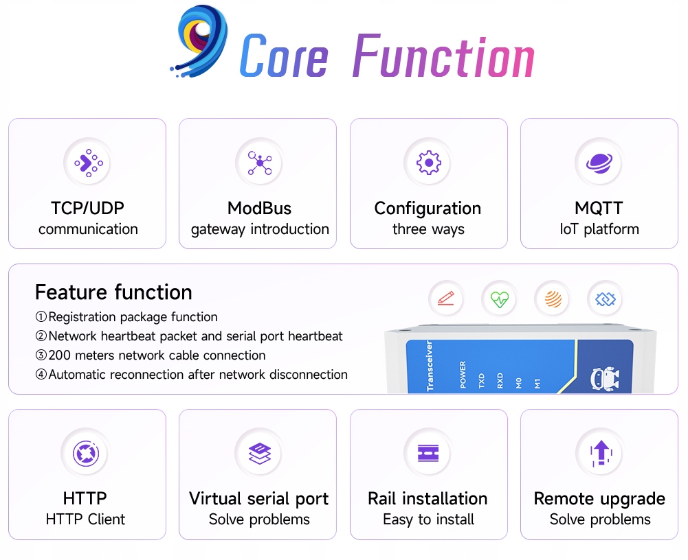 - Поддерживает несколько режимов работы (TCP-сервер, TCP-клиент, UDP-сервер, Клиент UDP (протокол HTTPPC, протокол MQTTC);