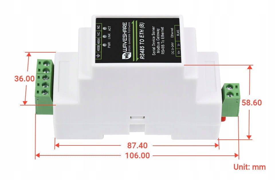 ⭐Промышленный последовательный сервер, RS485/RJ45 Ethernet, TCP/IP для монтажа на рейке. Промышленный последовательный сервер RS485/RJ45 Ethernet и TCP/IP, монтируемый на рейку, предназначен для промышленного применения. Он сочетает в себе несколько функций в одной, включая последовательный сервер, шлюз Modbus, шлюз MQTT, RS485 в JSON и т. д. Модуль имеет порты RS485 и Ethernet, использует винтовые клеммы для ввода питания, который поддерживает широкий диапазон напряжения: 9 ~ 24 В. Огнестойкая конструкция корпуса для монтажа на рейку с компактной площадью основания очень проста в установке. Подходит для таких приложений, как сбор данных, шлюз Интернета вещей, безопасность Интернета вещей, интеллектуальный мониторинг приборов и многое другое!