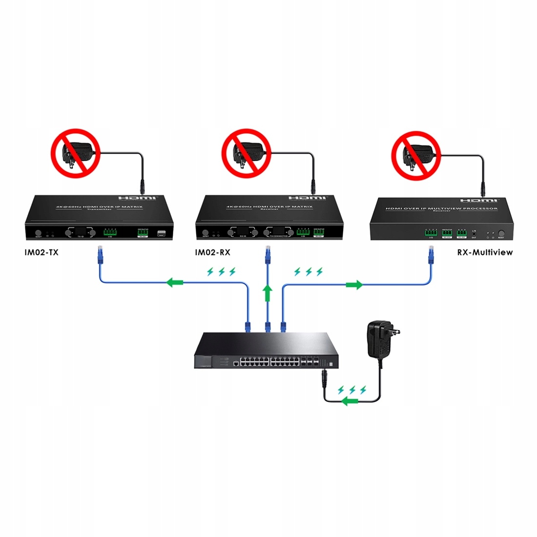 Передача HDMI выполняется через сеть стандартной LAN (CAT5E/CAT6), и благодаря POE приемники не требуют дополнительных источников питания.