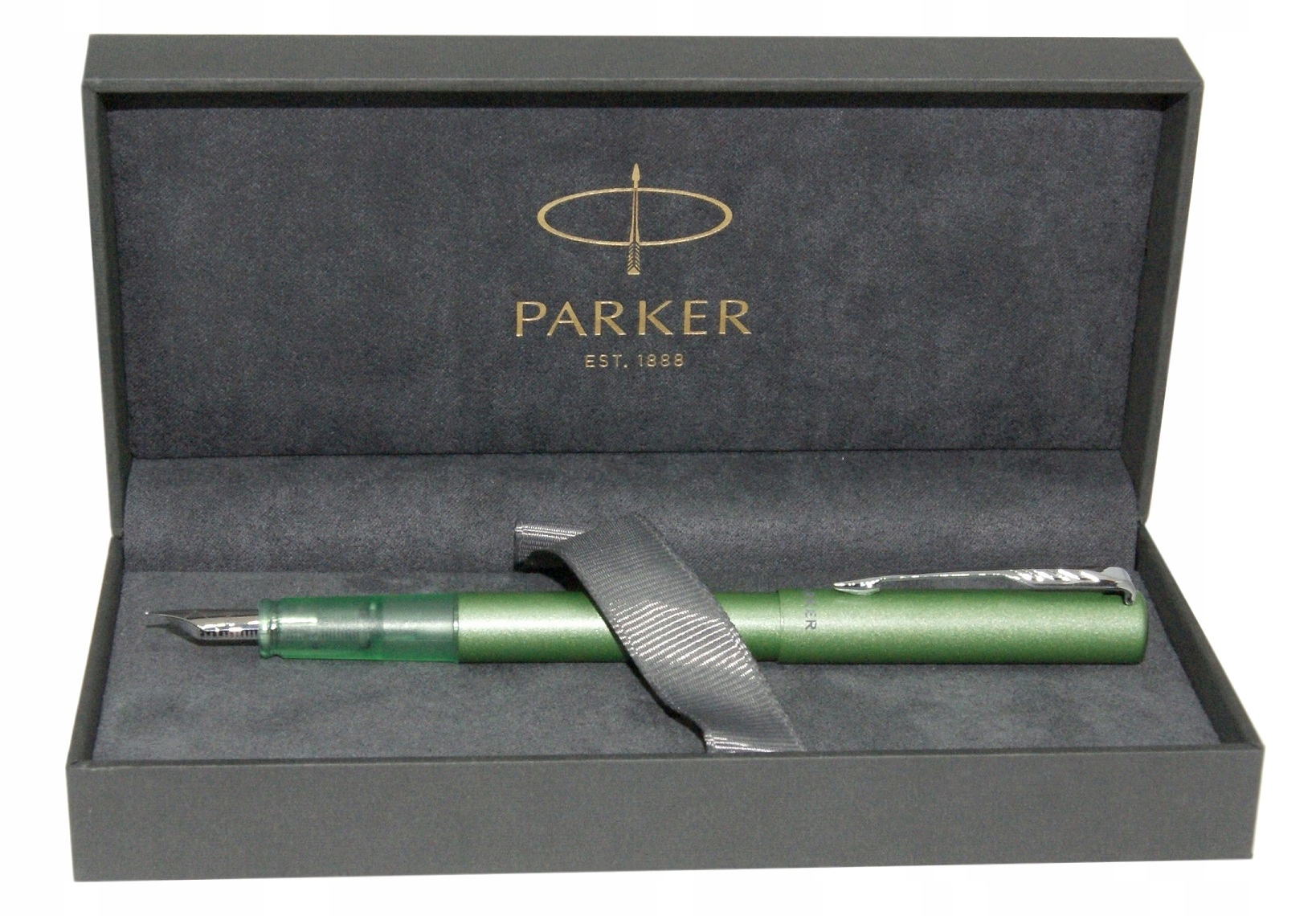 Атласно-зеленая металлическая отделка дополняется хромированной отделкой и характерным зажимом-стрелкой PARKER. Она имеет уникальный прозрачный корпус, позволяющий увидеть внутренний механизм ручки. Большой прочный наконечник из нержавеющей стали обеспечивает комфортное и плавное письмо.