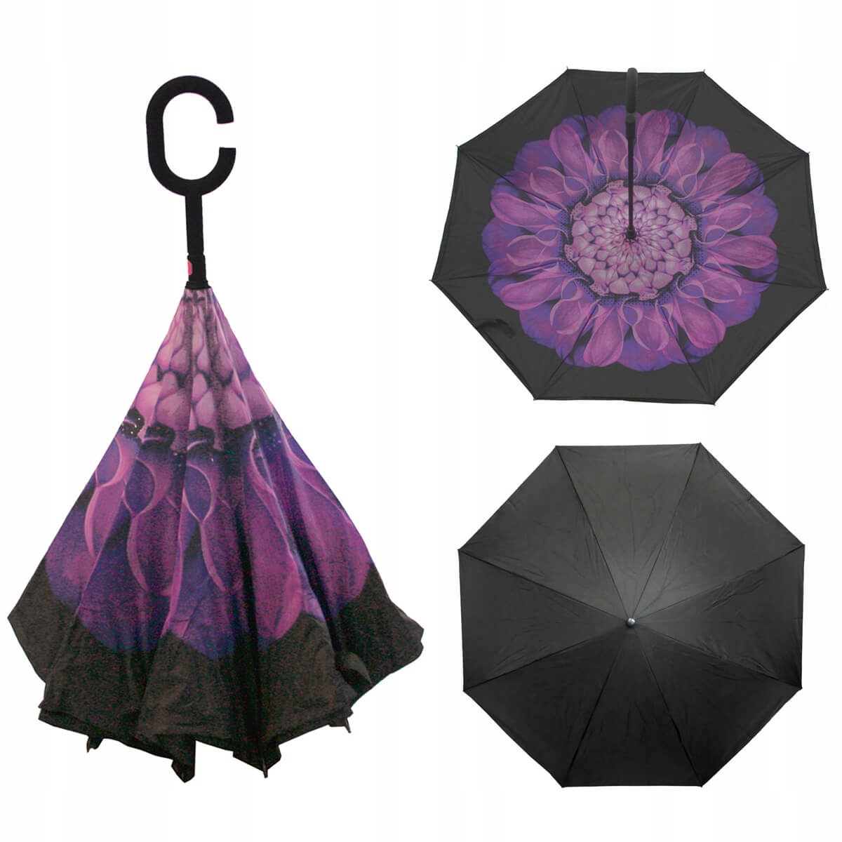 Очень креативный женский перевернутый зонт "REVERS". Зонт, который складывается в противоположном направлении, чем традиционные зонты. Зонт REVERS особенно устойчив к сложным погодным условиям. Два слоя материала: внутренний (цветной) и внешний (черный) гарантируют очень высокую устойчивость к сильному дождю и ветру.