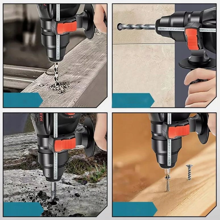 👍👍👍 ПРОСТОТА В ЭКСПЛУАТАЦИИ: можно легко переключать три режима работы: только молоток (только долбление), только перфоратор (молоток и обороты) и только дрель (только обороты). 1-кнопочный режим для ручного переключения между молотком, дрелью, долотом и перфоратором для сверления бетона, цемента, кирпича, дерева и камня.
