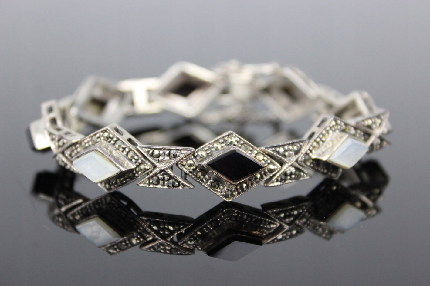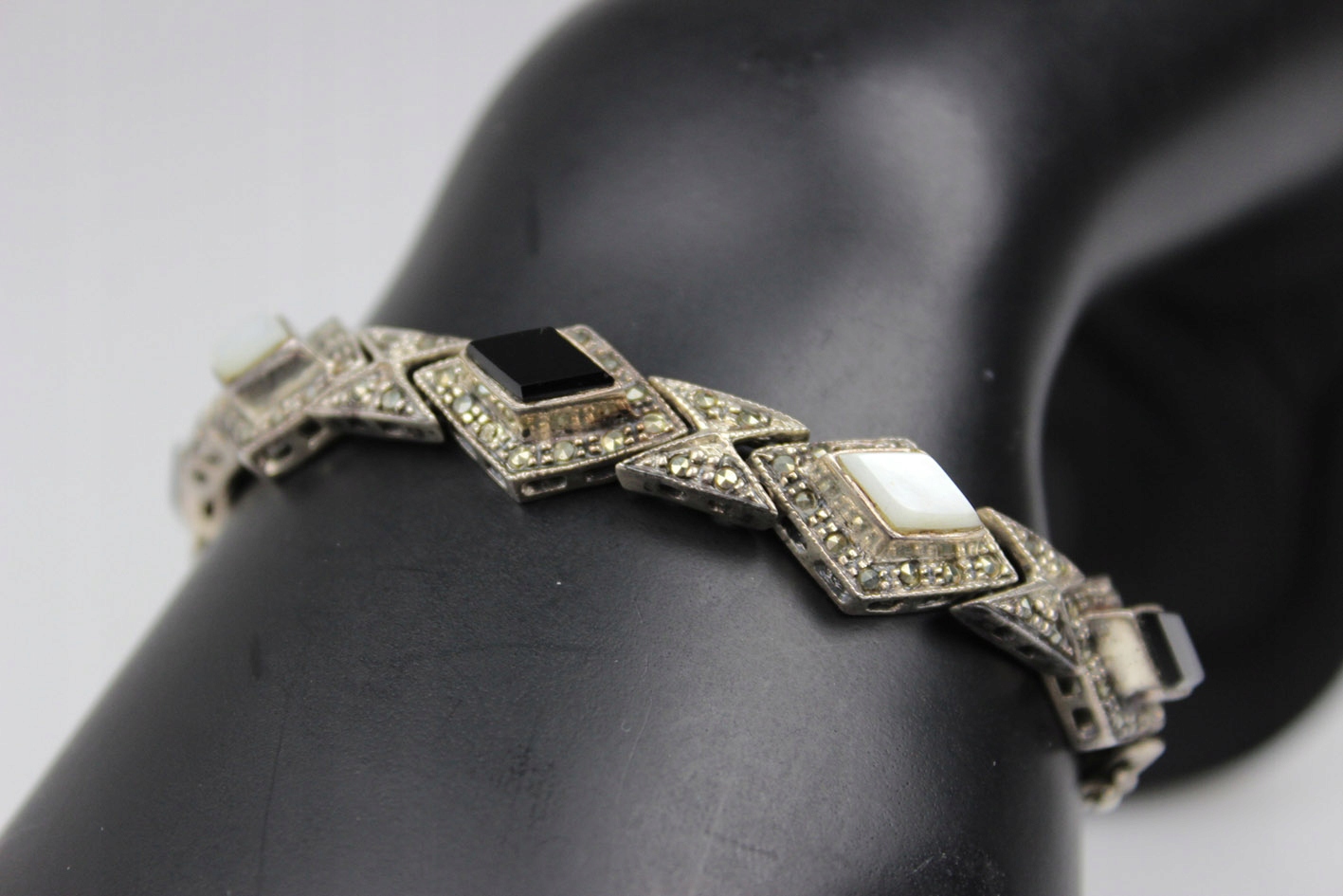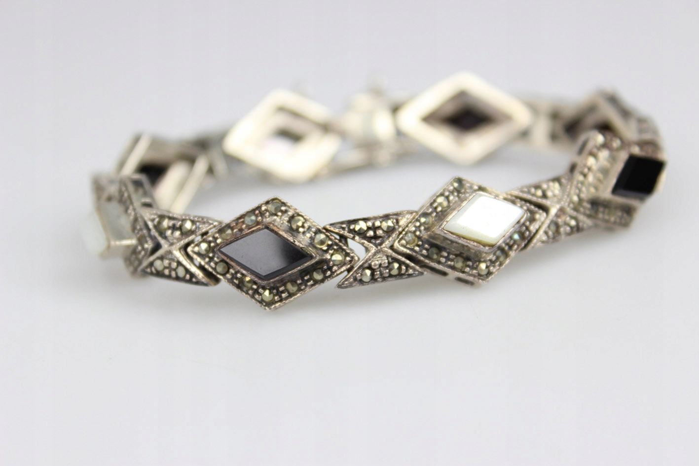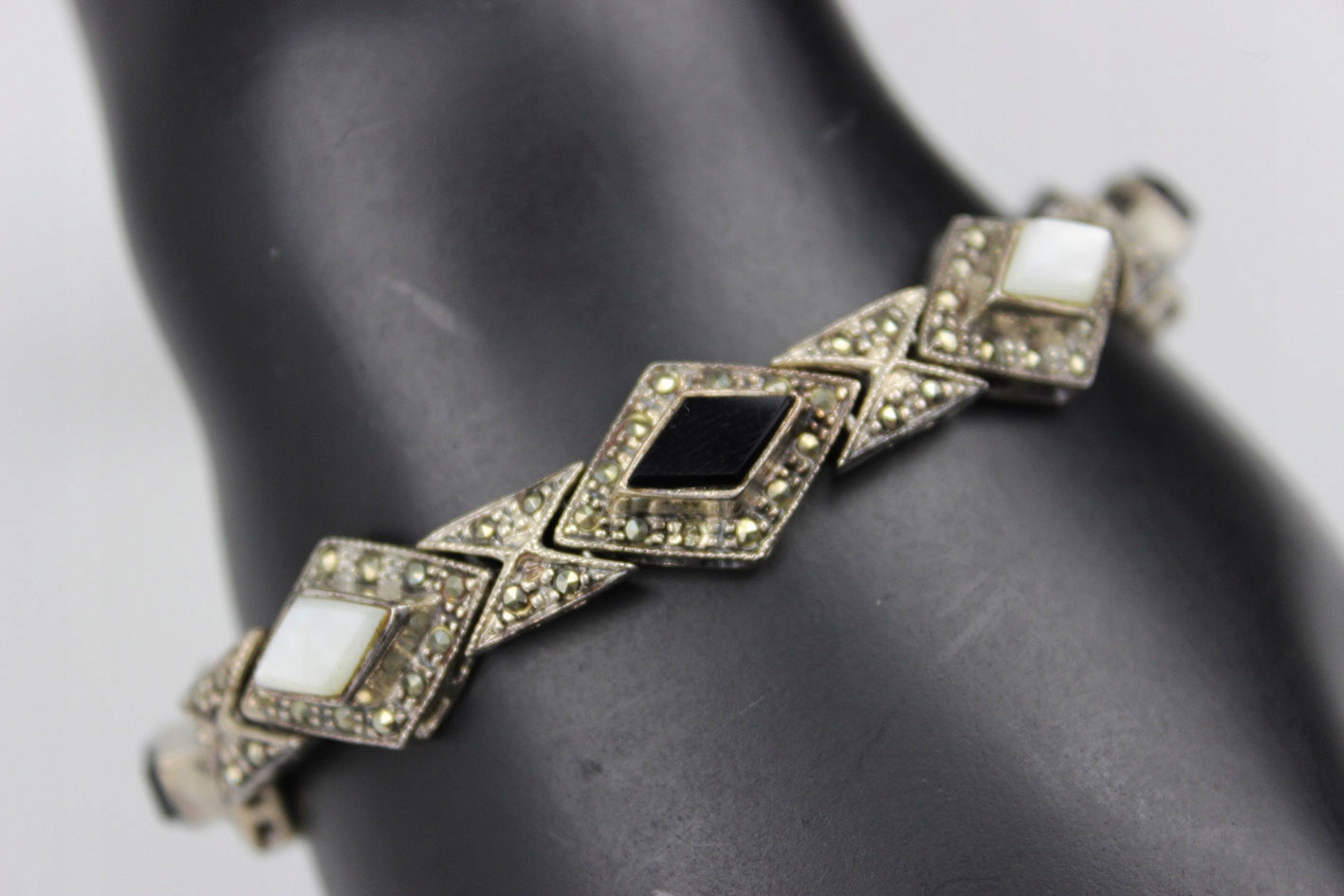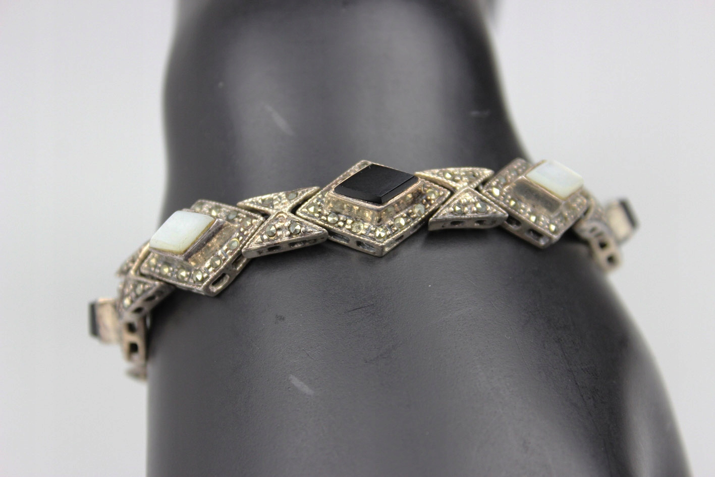 Феноменальный браслет в духе ар-деко, выполненный из серебра (без подписей - проба). Модель родом из 1980-х годов, когда ювелирная мода вернулась к классическим геометрическим формам, сочетающим элегантность с четким графическим ритмом узора. Композиция состоит из ромбовидных звеньев, усыпанных марказитами, с чередующимися камнями черного оникса и бело-опалесцирующего перламутра. Контраст цветов – черного, серебристого и жемчужно-белого – придает украшению изысканный, театральный характер, типичный для стиля 1920-х годов, которым оно было вдохновлено. Размеры: