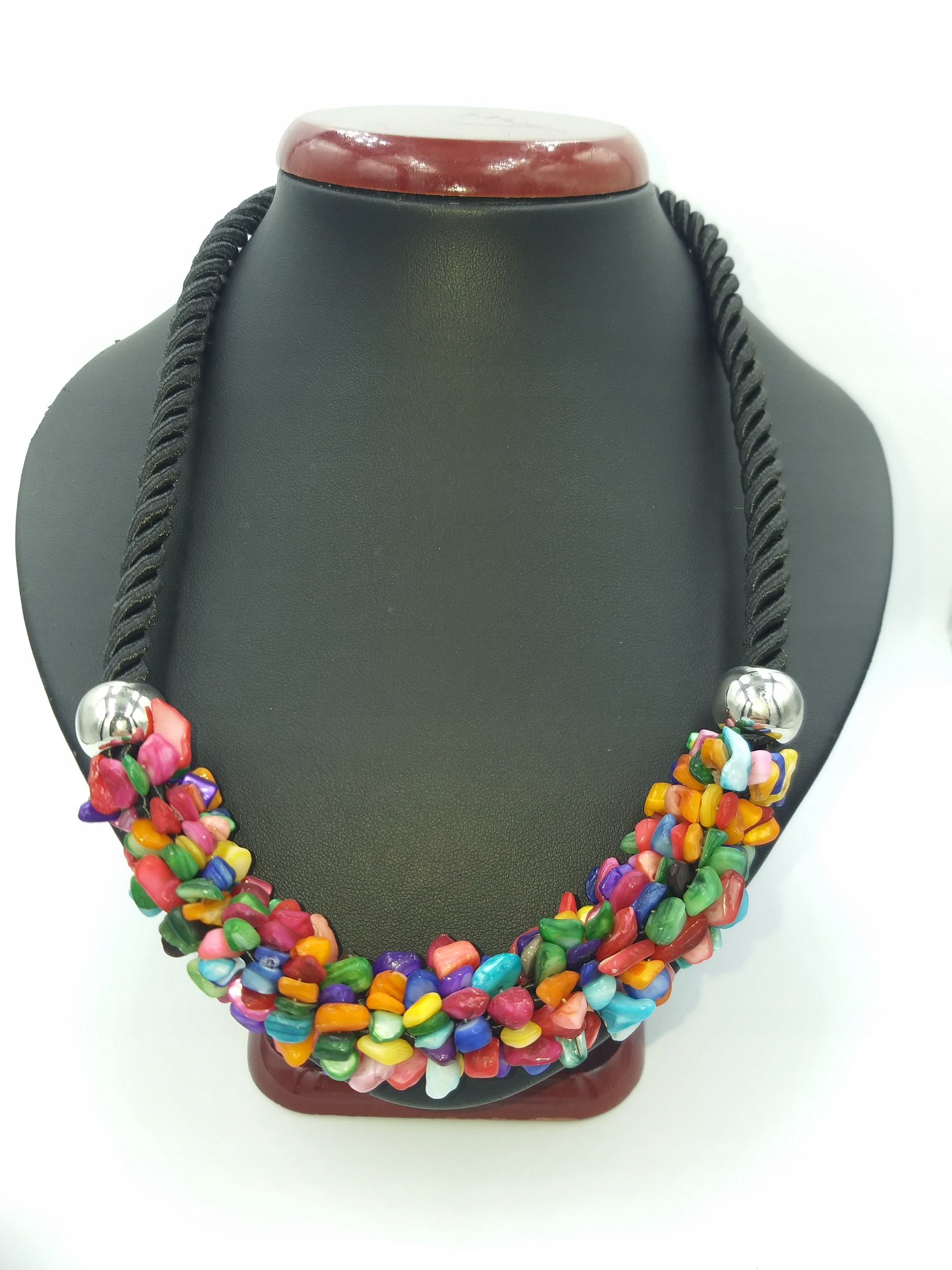 Перламутровое колье выполнено из тонкой плевелы, наплетенной на черную нить.