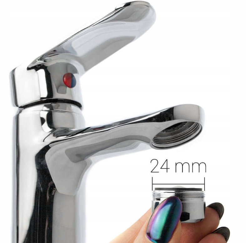 Подходит к 95% кранов. Резьба в этом аэраторе расположена снаружи корпуса и имеет диаметр 24 мм.