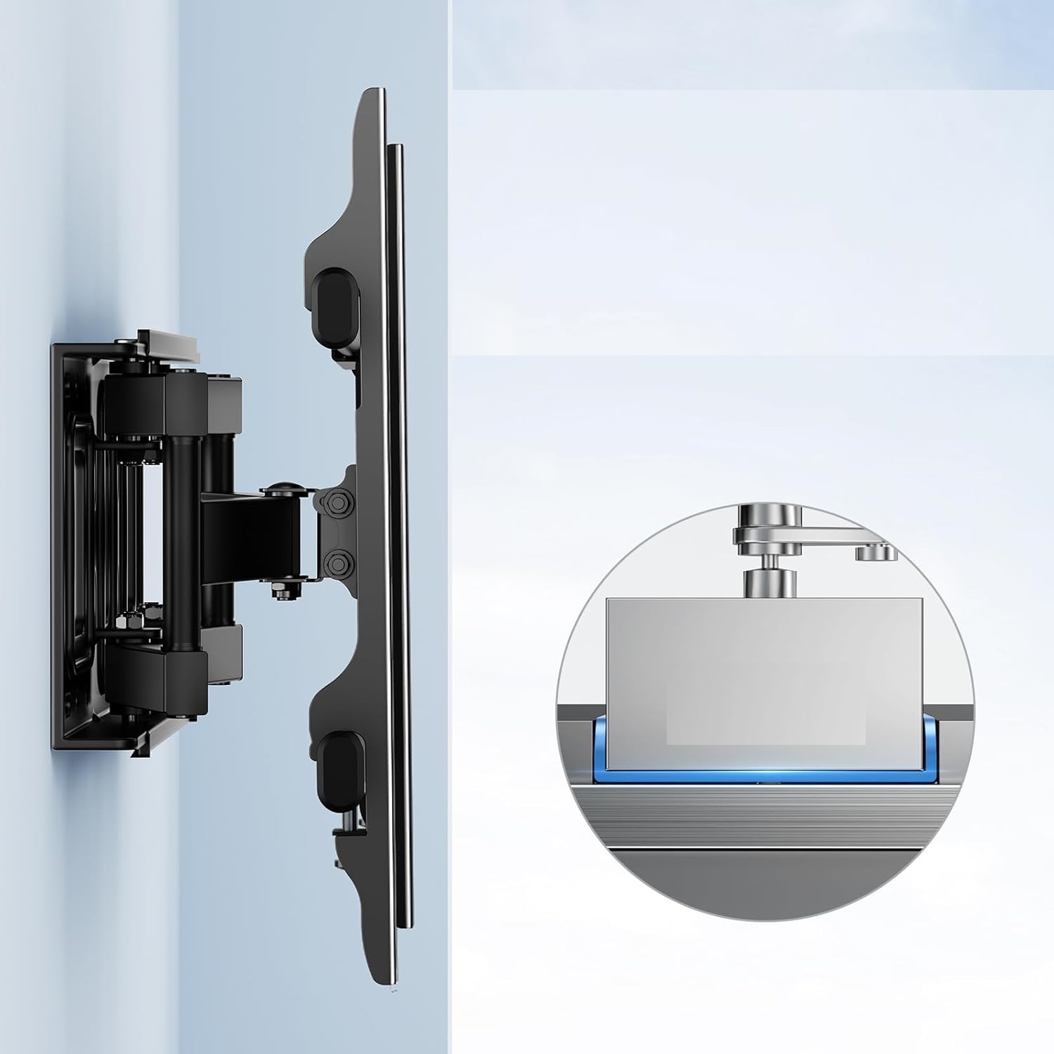 Настенное крепление для телевизора выдвигается из исходного положения на расстояние до 72 мм от стены для экономии места, а также может выдвигаться на расстояние до 390 мм от стены. Это экономит ценное пространство и придает дому красивый и аккуратный вид.