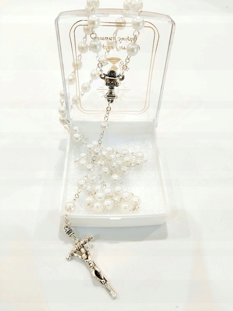 Причастие Розария для девочки или мальчика, сделанная из жемчужной бусинки. У него красиво мерцающее покрытие. Крест и чашка IHS, сделанные из металла, отличаются их необычайным вниманием к деталям.