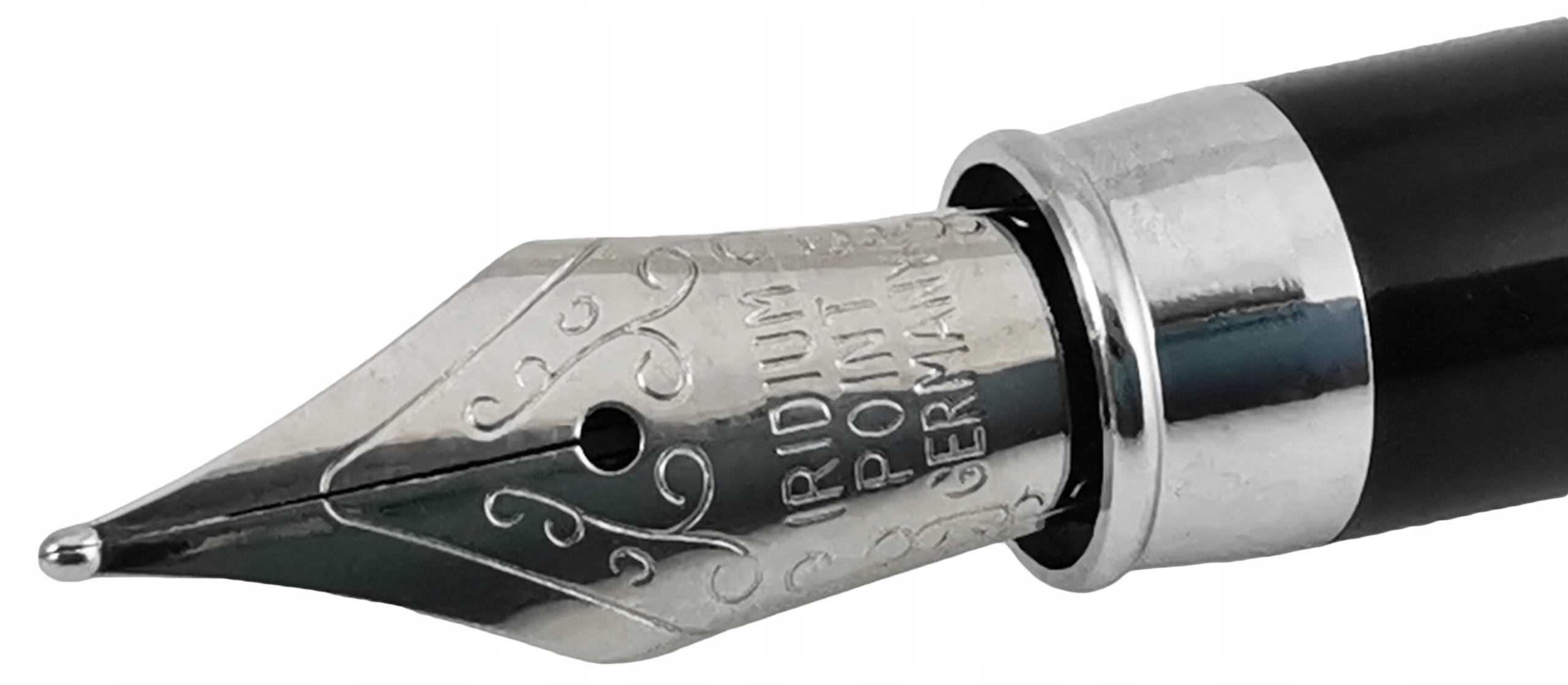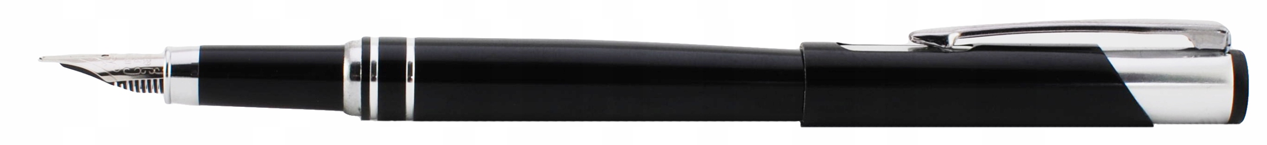 Ручка самой популярной простой формы. Классический декорированный стальной перо средней, самой популярной толщины. Пластиковый держатель пера. Корпус, колпачок, кольца и клипса металлические. Черная краска на кузове. Серебряная отделка.