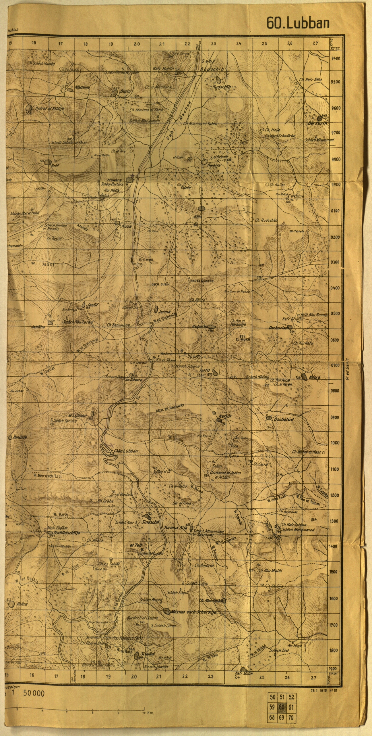 Мировая война, Палестина. Карта 13.01.1918, от наследия майора Микзислава Сконечни, который, будучи лейтенантом немецкой армии, остался на Ближнем Востоке (Тюркие был в то время союзником Германии, а ее армия сражалась на Ближнем Востоке с англичанами); районы между Лакиф Кафром на севере и малико -плитой на юге; Следы складывания, линии на карте, рисунки, сделанные сотрудниками; Размеры листа после распространения: ок. 558x555 мм.
