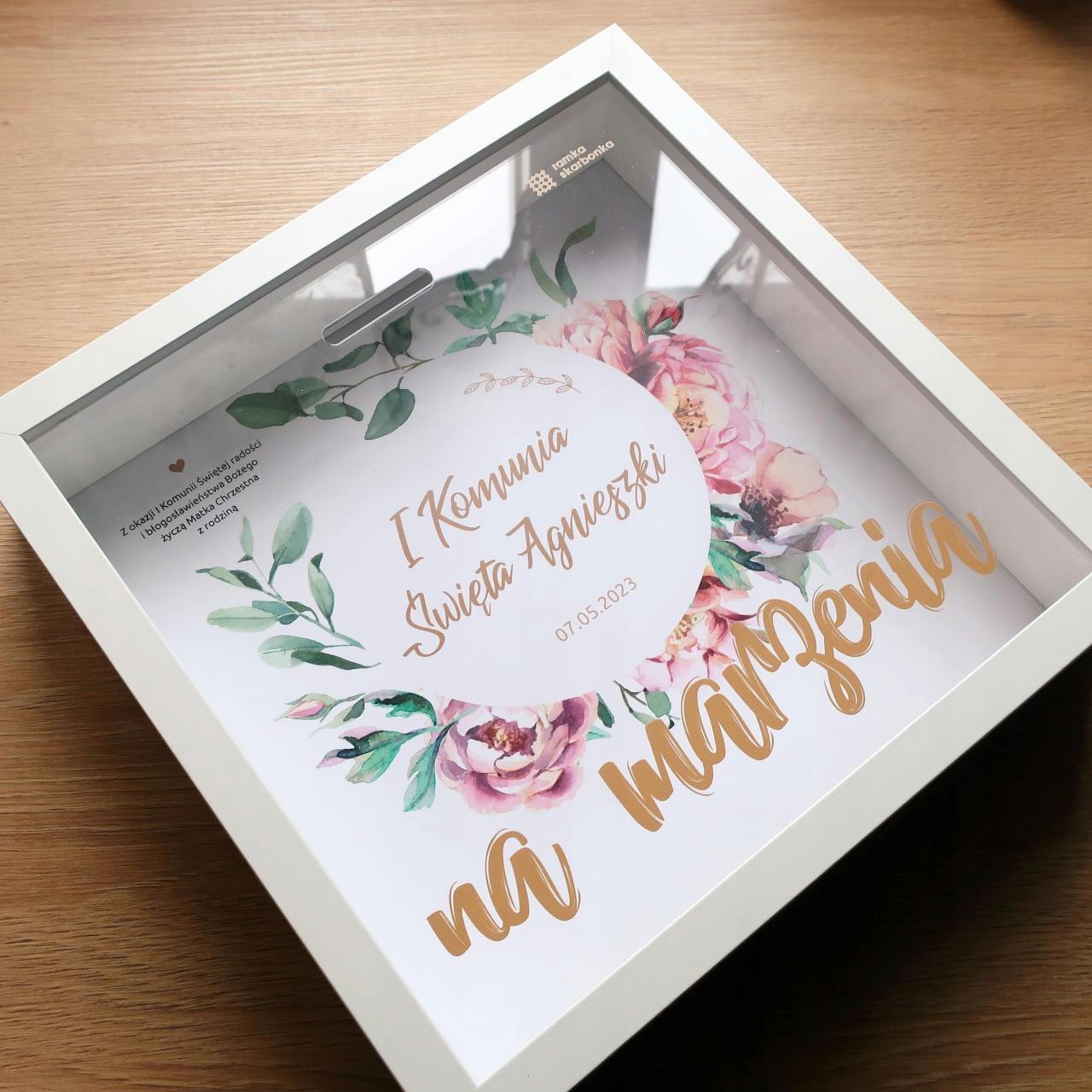 Рамка-копилка для Первого Причастия – красивый и практичный подарок детям в этот особенный день. Есть на лицевой стороне рамки золотая надпись «Для мечты», а на фоне с цветами есть места для персонализации, например, имя ребенка, дата торжества и посвящения. Рамка - это не только украшение, но и практичное место для хранения детских сбережений.