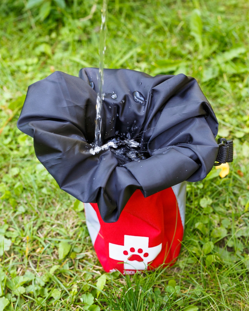 Набор для первой помощи был сделан из постоянного и погодного материала кодуры. Дополнительная подкладка внутри гарантирует водонепроницаемость, благодаря этому оборудованию не будет промокнуть, даже если у первой помощи будет незапланированный контакт с водой. Дополнительной особенностью является возможность превратить его в миску в воду - удалив пакетин с оборудованием и извлекая часть набора первой помощи.