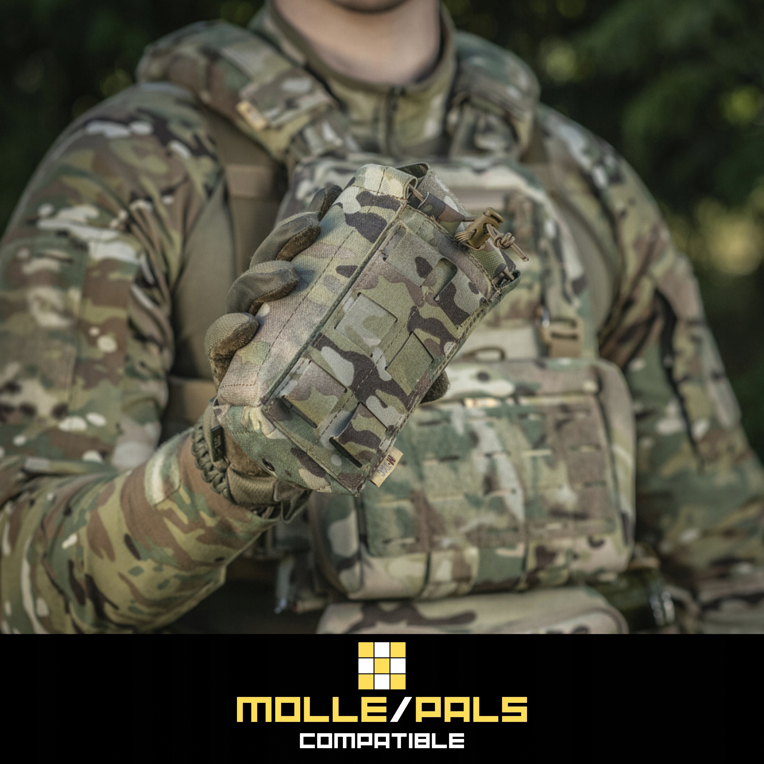 Совместимость с системой крепления MOLLE/PALS позволяет быстро прикрепить контейнер к тактическому ремню, жилету, рюкзаку или другому поддерживающему это снаряжению. система.