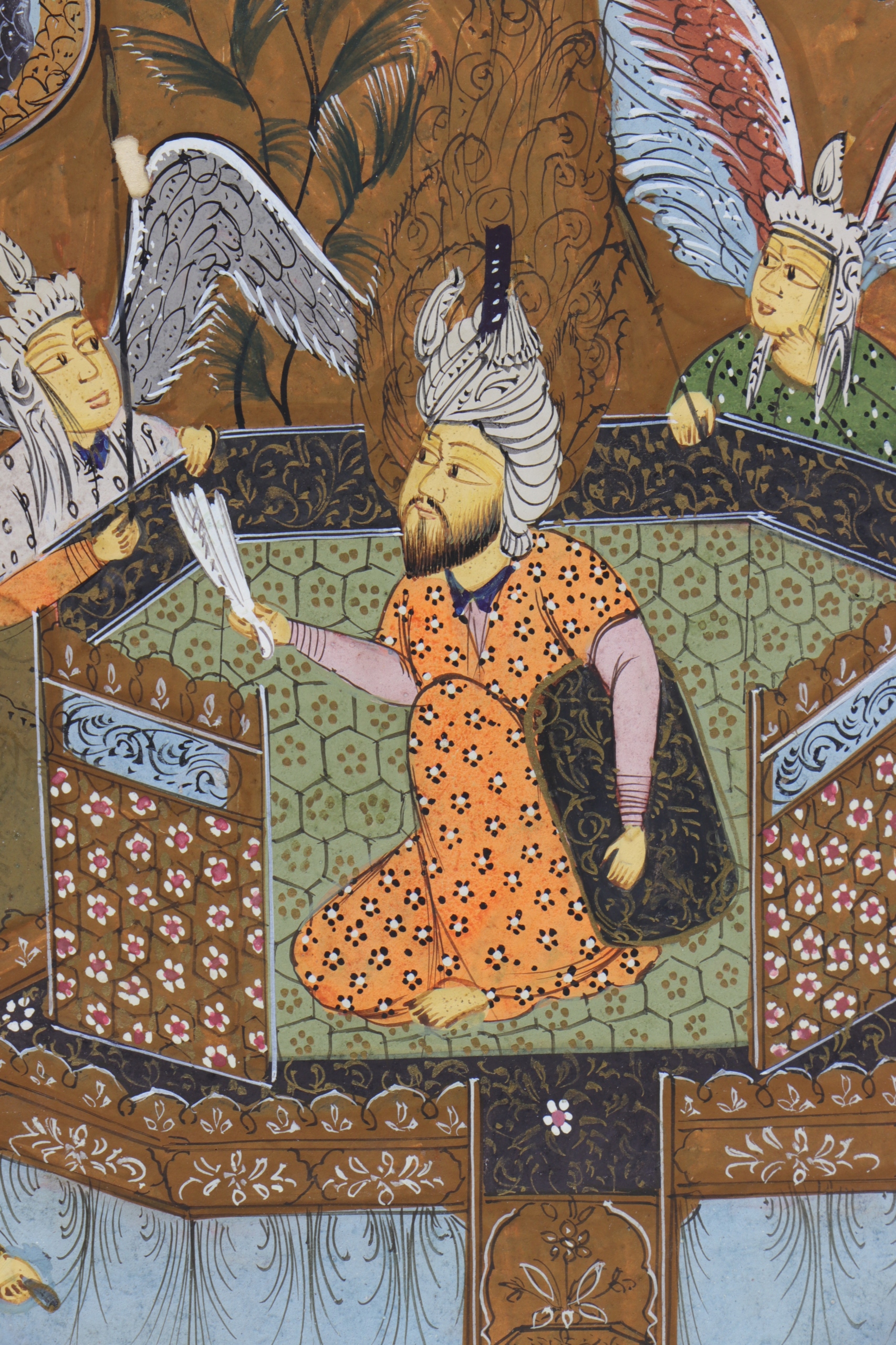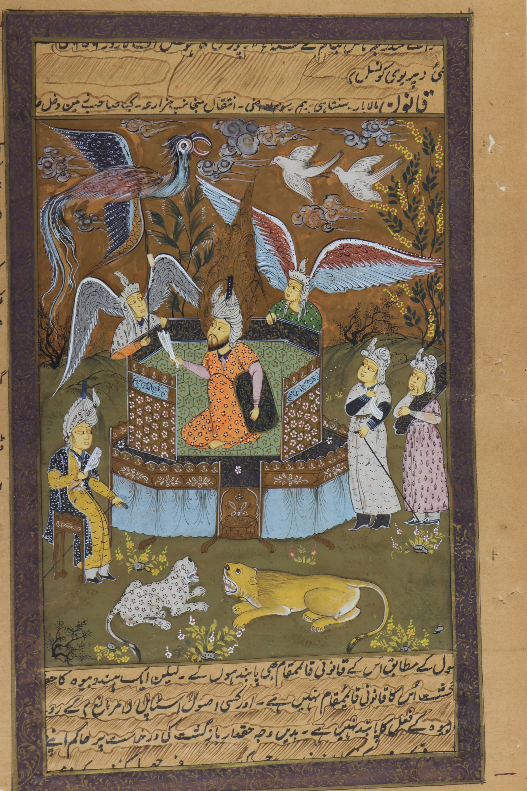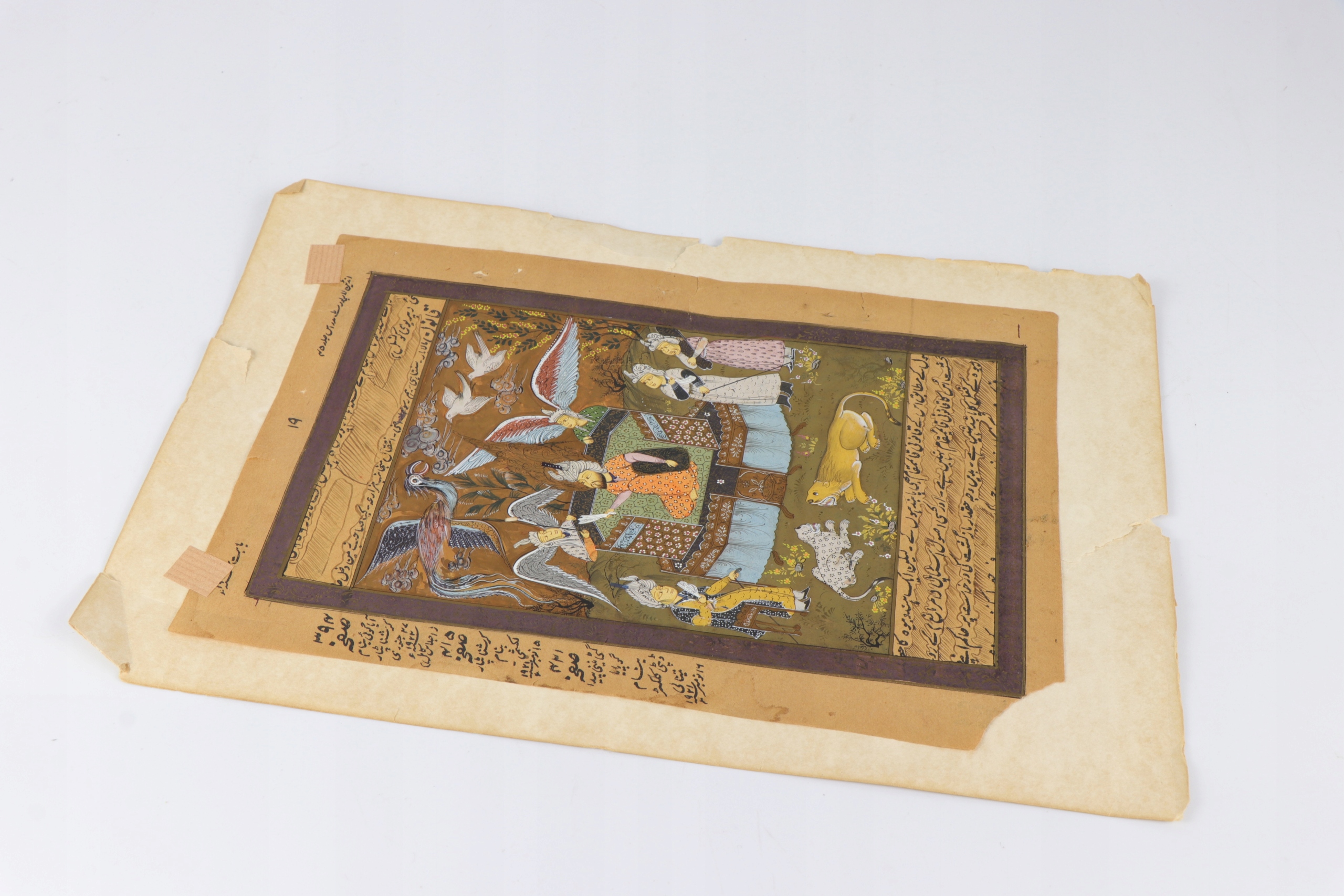 Старая миниатюра, рукописная и раскрашенная из персидско-индийской книги, написанная шрифтом урду. Сценарий урду модифицирован персидским арабским письмом. На рисунке изображено несколько фигур, две с крыльями, в нижней части лев и леопард. Миниатюра может относиться к зороастрийской религии, основанной пророком Заратуштрой между 1500 и 500 годами до нашей эры. Это дуалистическая религия, центральным мотивом которой является вечная борьба между Ахура Маздой (добром, светом, истиной) и Ангра Майнджу (злом, тьмой, ложью). Ключевые элементы включают культ священного огня, веру в свободу выбора человека между добром и злом и эсхатологические верования. На оборотной стороне тексты относятся к закону. Бумага с характерной структурой ребристой бумаги ручной работы.