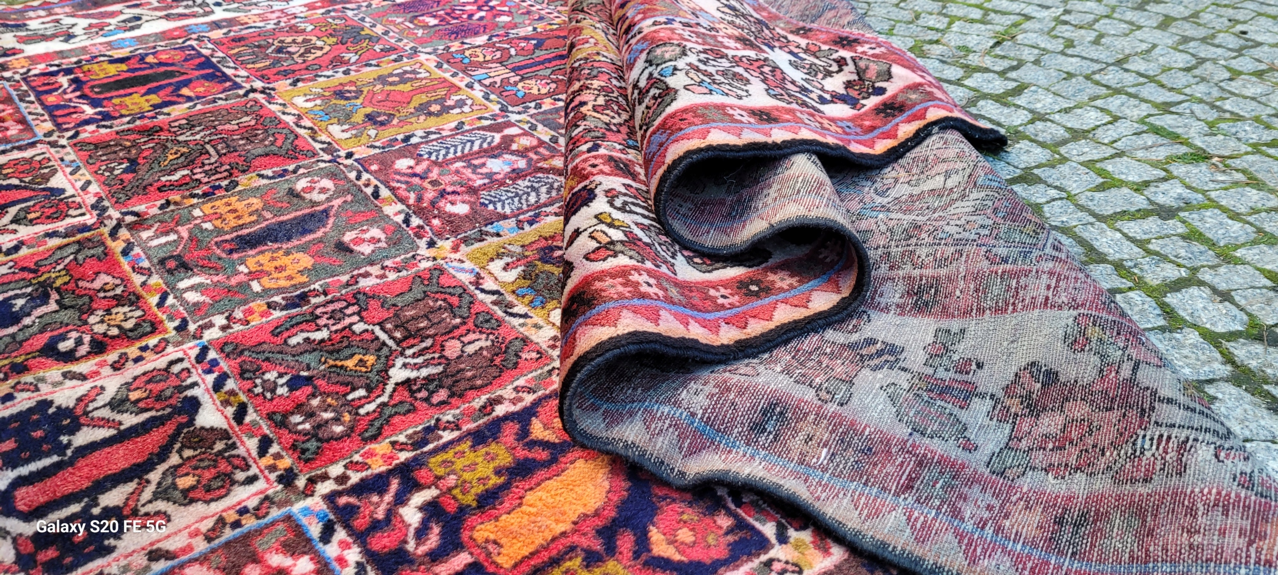 Персидский, старый коврик Бактамр. Сплетен вручную от шерсти высочайшего качества. Он характеризуется компактным, приятным для сенсорного флиса и красивых цветов и дизайна. Он сохранился в хорошем состоянии. Он имеет миграцию красителя.