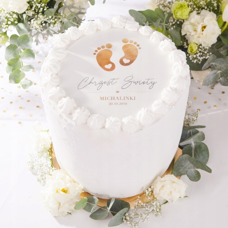 Украшением торта на Крещение вашего малыша не обязательно должны быть только свечи. Фантастическое решение – вафельная вафля с именем ребенка, датой торжества и красивым изображением золотых ножек.