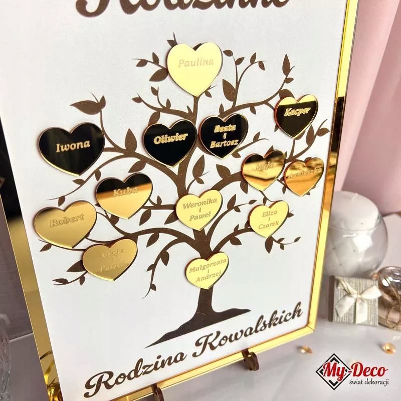 Сердечки с именами Ваших близких так же тщательно выполнены из зеркального золотого акрила, на них точно выгравированы имена.