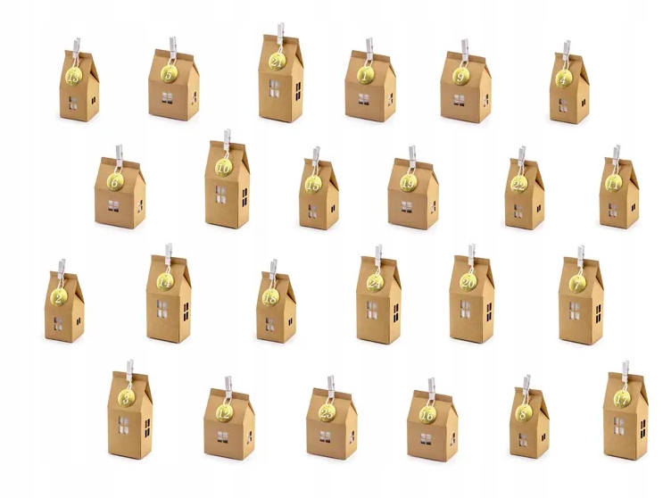 - 3 выкройки домиков из крафт-бумаги, по 8 каждой выкройки (размеры: от примерно 5 х 11 х 5 см до примерно 7 х 11 х 5 см),