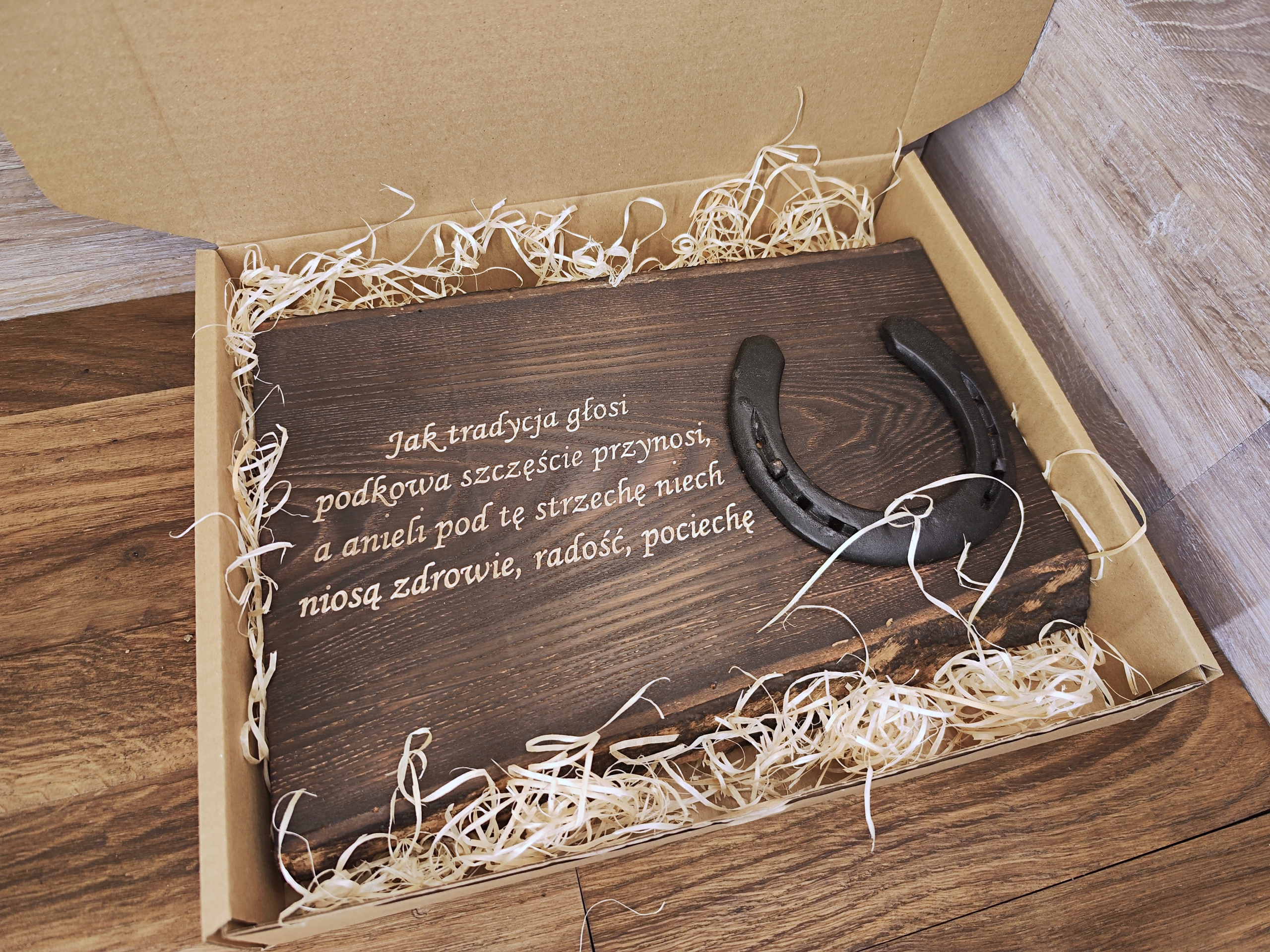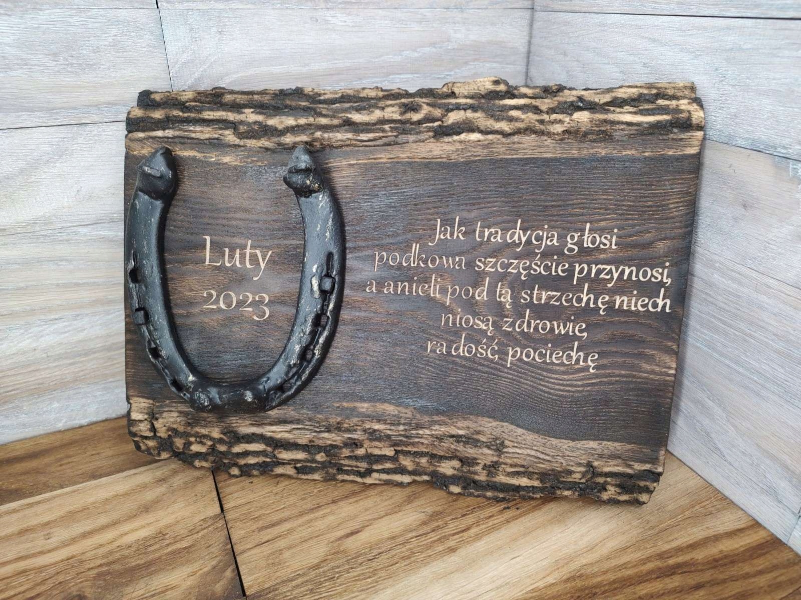Старая подкова прикреплена оригинальными гвоздями к толстой обожженной доске, на которой можно разместить любой текст - уникальный гаджет, который можно повесить на стену или поставить на стол. Идеально подходит в качестве подарок на свадьбу, день рождения или юбилей.
