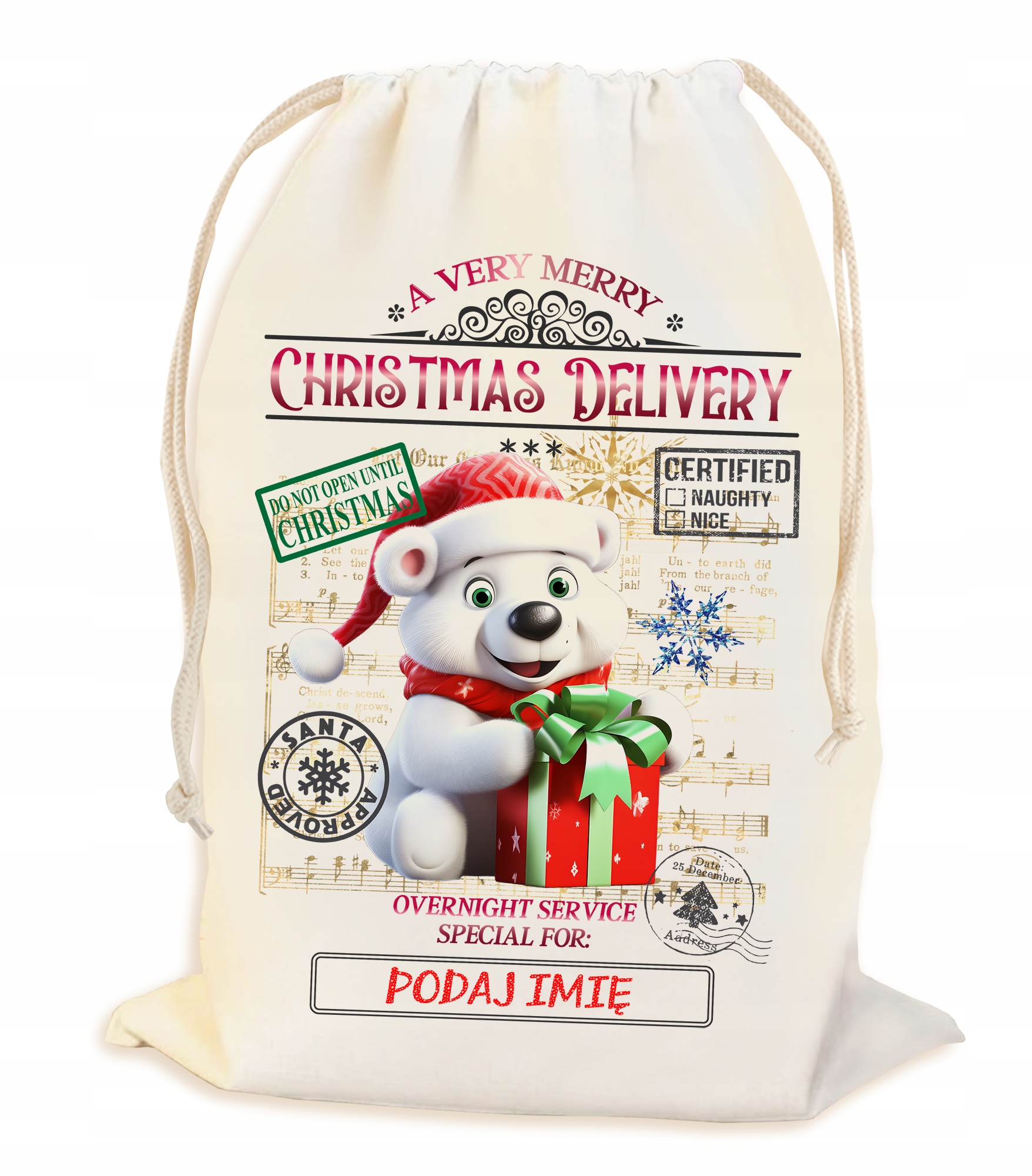 ПЕРСОНАЛИЗИРОВАННАЯ СУМКА С ИМЕНЕМ ИЗ ОРГАНИЧЕСКОГО ХЛОПКА 200 г/м2, СКРУЧЕННАЯ С ОБЕИХ СТОРОН ХЛОПКОВОЙ НИТЬЮ. ОТЛИЧНОЕ РЕШЕНИЕ ДЛЯ УПАКОВКИ РОЖДЕСТВЕНСКИХ ПОДАРКОВ ПОД ЕЛКОЙ, ОСОБЕННО ДЛЯ ДЕТЕЙ.