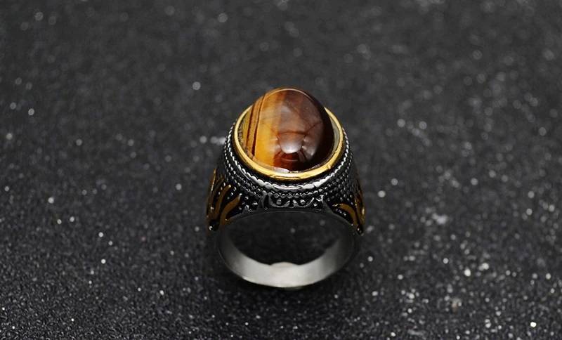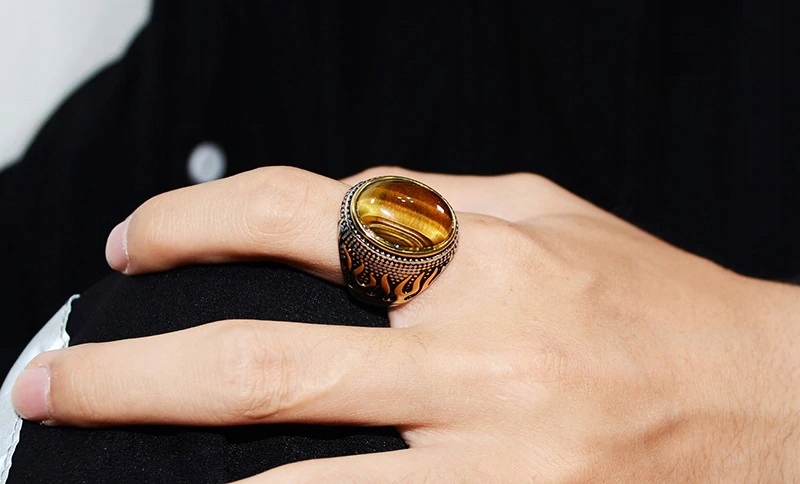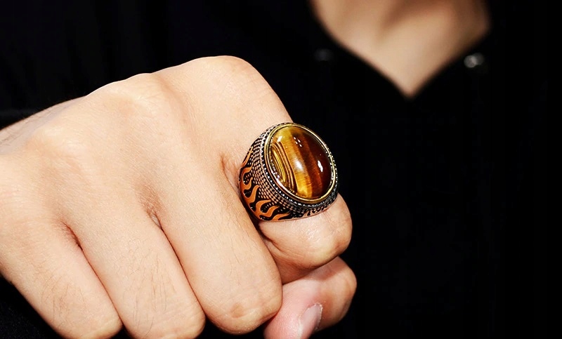 Красивое огненное кольцо с камнем тигровый глаз