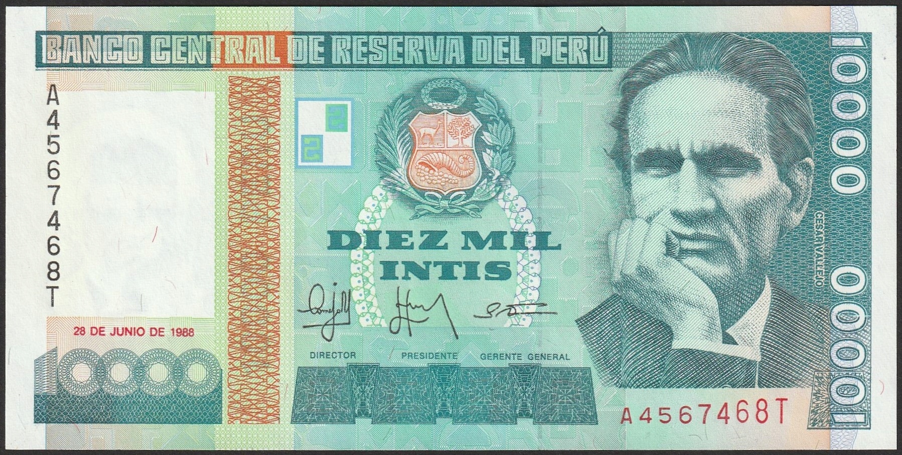 Peru 10000 intis 1988 - Cesar Vallejo - A - stan bankowy UNC