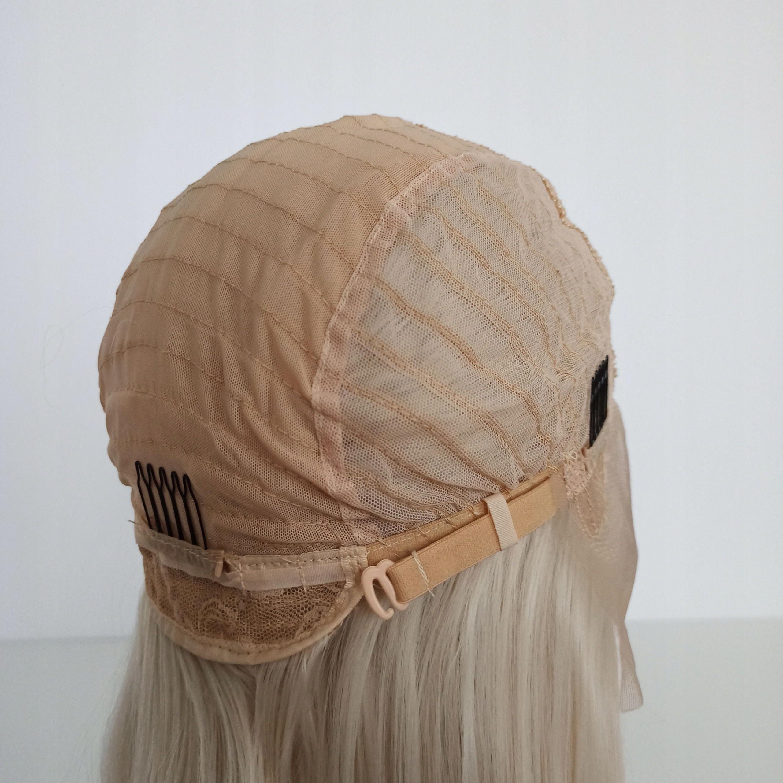 Внутри парика прикреплен ремешок, позволяющий регулировать окружность, благодаря чему парик идеально сидит на любой голове. У него также есть шпильки, с помощью которых можно прикрепить парик к волосам.
