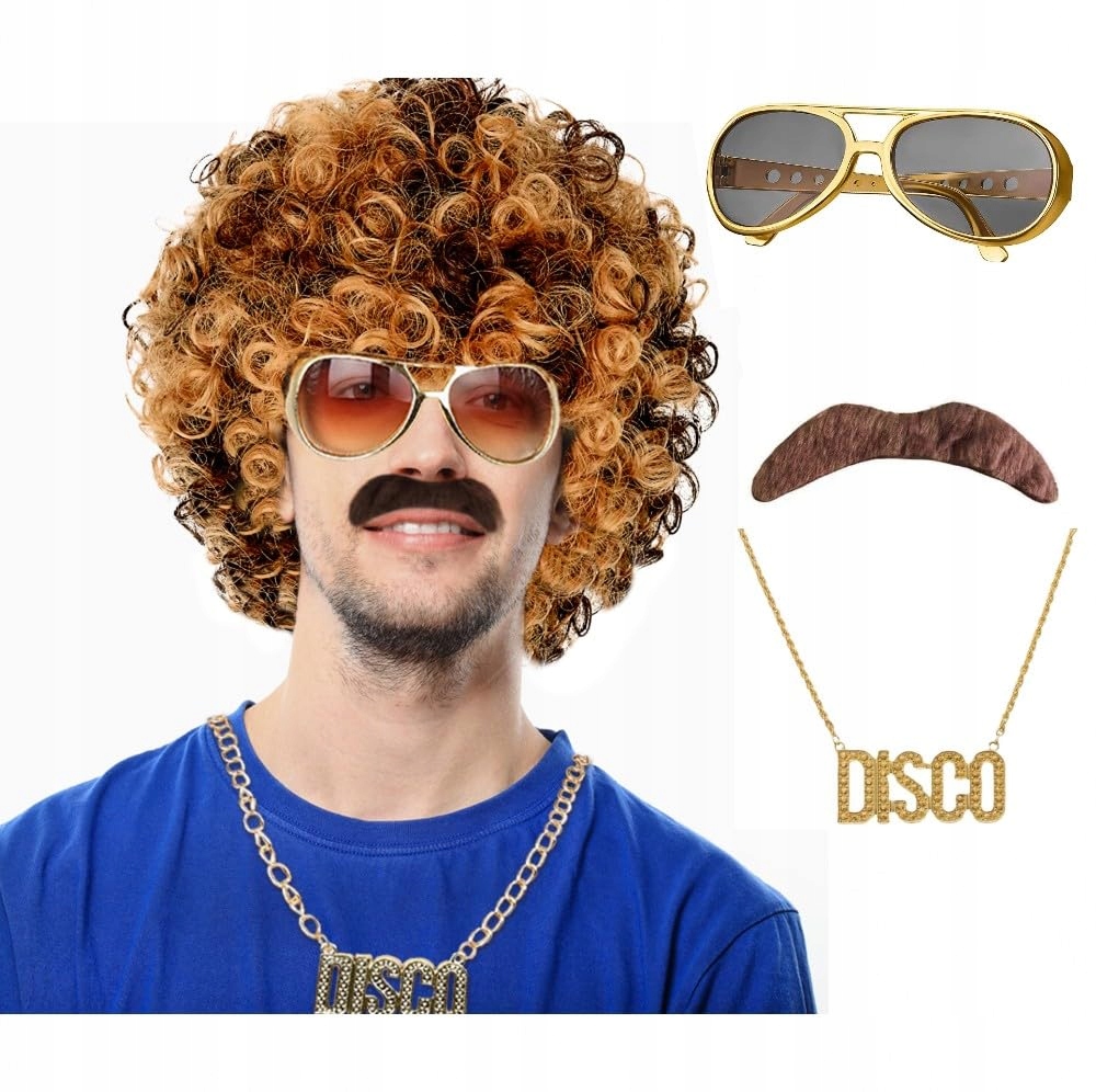 - В комплект входят: аксессуары для костюмов 70-х годов: парик, цепочка, усы, солнцезащитные очки, красивый аксессуар для костюма.