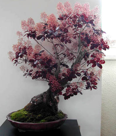 КОТИНУС КОГГИГРИЯ (COTINUS COGGYGRIA) широко и густо ветвящийся, вырастает до 5 м в высоту, может иметь любую форму «любит быть подстриженным». Листья парикового дерева бордовые, иногда зеленые, скрученные, зимой опадающие, цельнокрайние, голые, широкоэллиптические, у основания клиновидные, сбегающие по черешку, вверху закругленные, снизу сизовато-зеленые, длиной 3-8 см. . Это полигамное растение (мужские, гермафродитные и недоразвитые цветки в одной метелке). Цветки одиночные мелкие, зеленовато-желтые, собраны в крупные, рыхлые, остроконечные метелки. Цветет на рубеже мая и июня. После цветения образуются красивые парики. Это нетребовательное растение и быстро растет. Уже в первый год может достигать 0,5 м. Перуковец - вполне морозостойкое в нашем климате растение, выдерживает понижение температуры до -28 С, прекрасно подходит для посадки в качестве солитера, т. е. отдельно стоящего растения, или для групповые посадки в качестве второго и третьего фона, также можно посадить перуковец для создания миниатюрных деревьев бонсай.