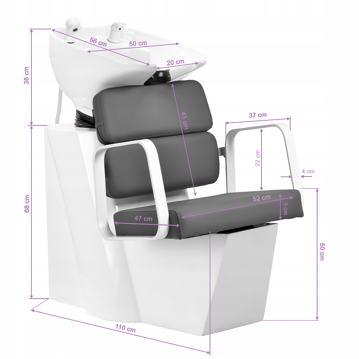Контурное кресло обеспечивает адекватную поясничную поддержку, а значит, высокий комфорт использования. Металлические подлокотники белого цвета геометрической формы позволяют правильно расположить плечи клиента. Наполнение прочным, устойчивым к деформациям поролоном и обивка из приятной на ощупь искусственной кожи серых оттенков обеспечивают долговечность мебели, удобство чистки и комфортное использование в течение длительного времени. Оригинальный, элегантный внешний вид автомойки придает интерьеру неповторимую выразительность. В комплект входит полная арматура в оттенках белого, включая смеситель, насадку для душа и специальные шланги, что обеспечивает полный набор инструментов для работы.