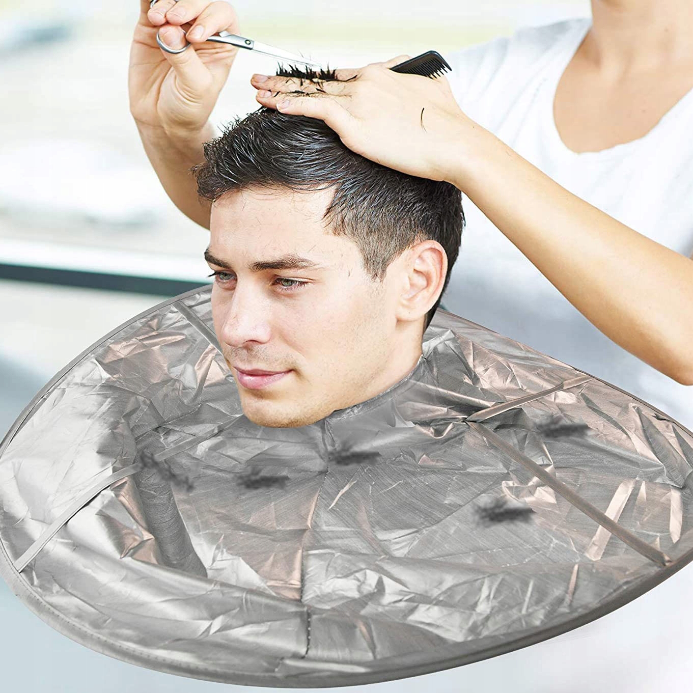 Продукт был построен так, чтобы подстриженные волосы останавливались в воротнике, не падая на пол. Это сэкономит время, вам не нужно собирать волосы из -под стула каждый раз, просто выбросьте их из воротника.
