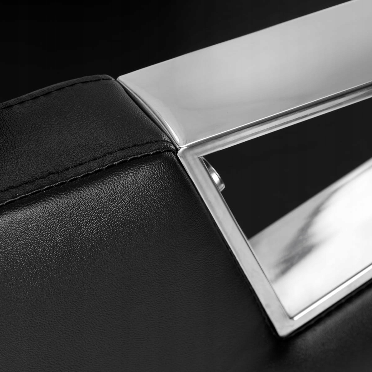 Современный предмет мебели наполнен прочным, устойчивым к деформациям поролоном, а обивка выполнена из приятной на ощупь синтетической кожи черного оттенка.