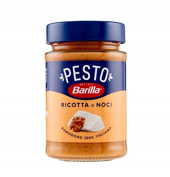 Состав: Масло подсолнечное, творог 20% (сыворотка, молоко), мякоть томата 17,3%, глюкозный сироп, томатная паста 5,7%, орехи грецкие 5%, базилик, Grana Padano DOP (молоко, яичный лизоцим), соль, орехи кешью, сухая сыворотка, сахар, рисовый крахмал, регулятор кислотности: молочная кислота, чеснок, натуральный ароматизатор (молоко), сухая пахта (молоко).