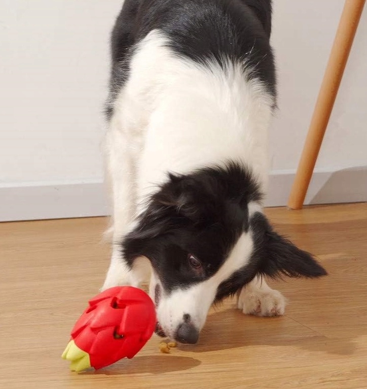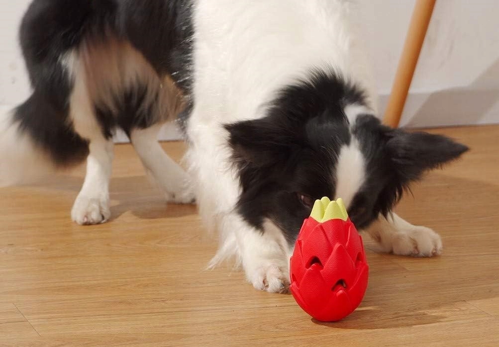- положите в клубнику лакомства или корм для собак (через отверстие внизу), дайте игрушку собаке поиграть. Его задача - доставать лакомства (сухой корм может выпадать через отверстия).
