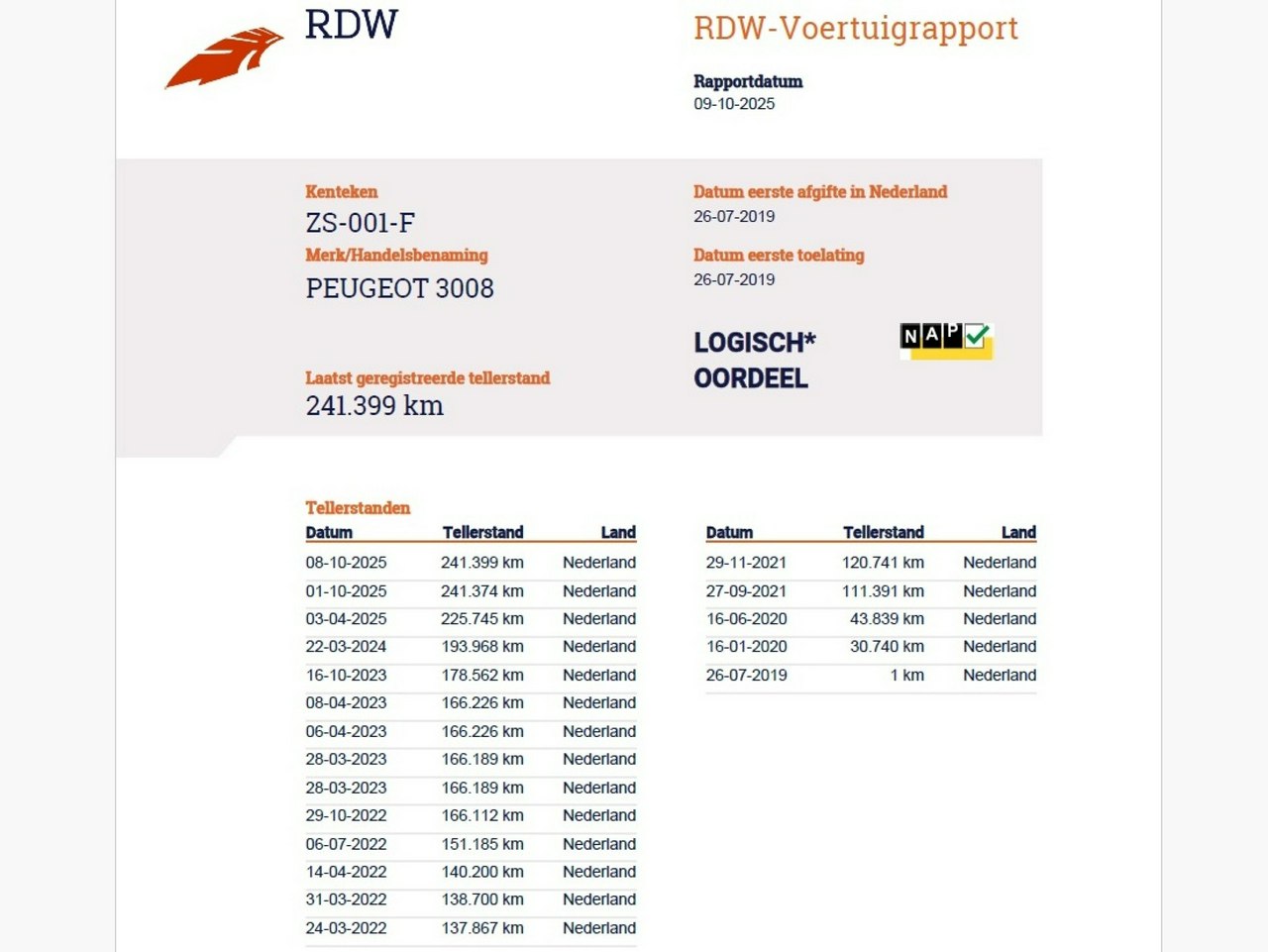 - пробег подтвержден сервисной книжкой и сертификатом NAP