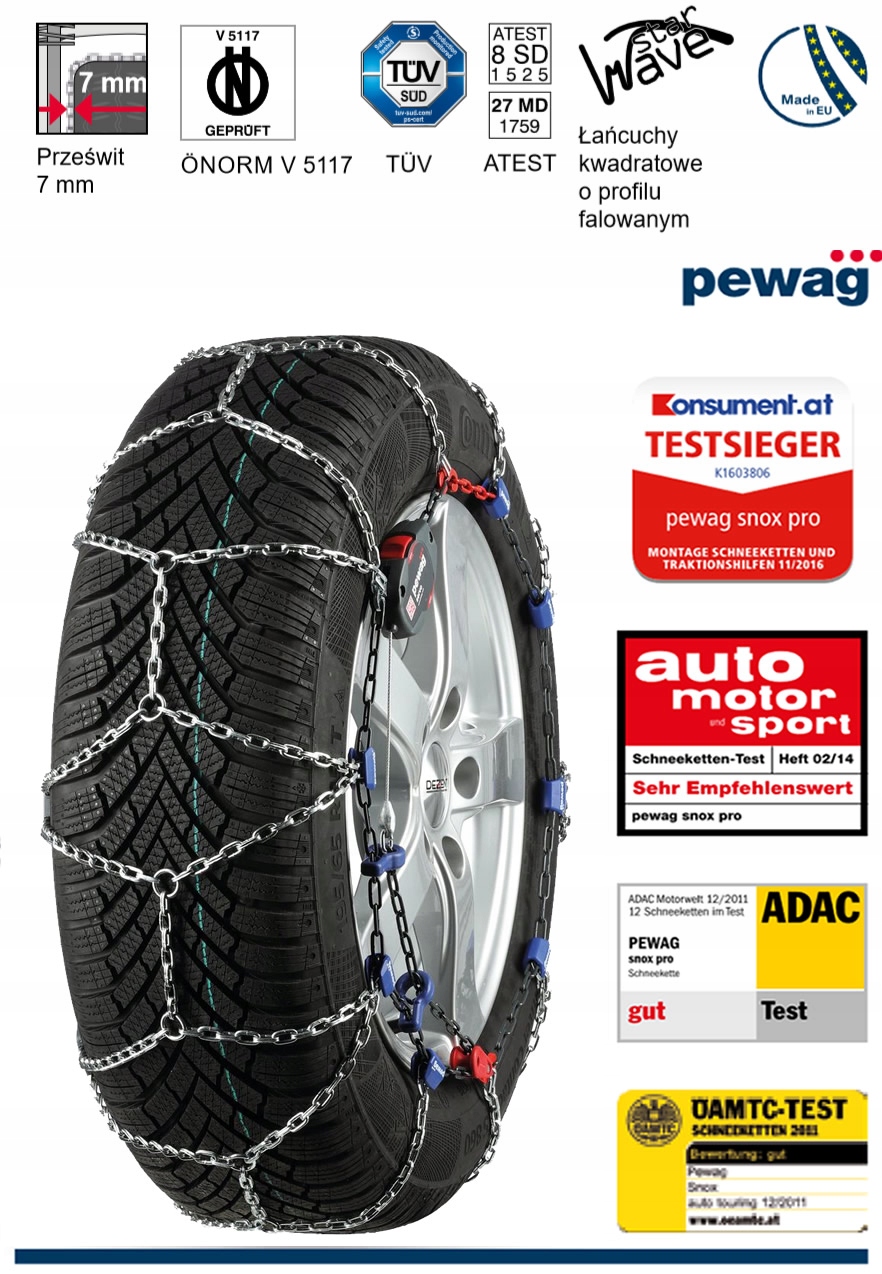 Благодаря плотной беговой сетке с ромбическим следом из звеньев диаметром 3,2 мм и квадратным сечением сервоцепи Pewag обеспечивают превосходное сцепление и высокий комфорт установки и использования.