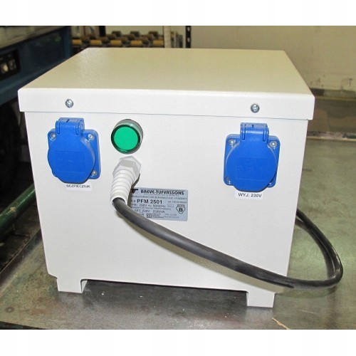 PFM 2501 Breve 230/230V разделение, переносное, закрытое трансформатор, предназначенное главным образом для применений, требующих защиты от электрического паралича и высокой степени защиты от IP. Портативная версия в металлическом корпусе, изолированной от защитной цепи и трансформатора. Рекомендуется для электроинструментов.