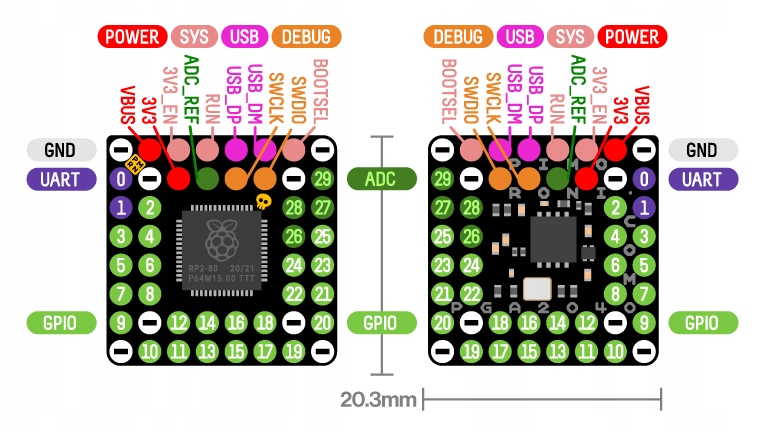 Аккуратная миниатюрная плата, оснащенная микроконтроллером RP2040 Raspberry Pi PICO. Система имеет два ядра ARM Cortex M0+, работающие на частоте до 133 МГц, 264 КБ оперативной памяти и 30 портов GPIO.