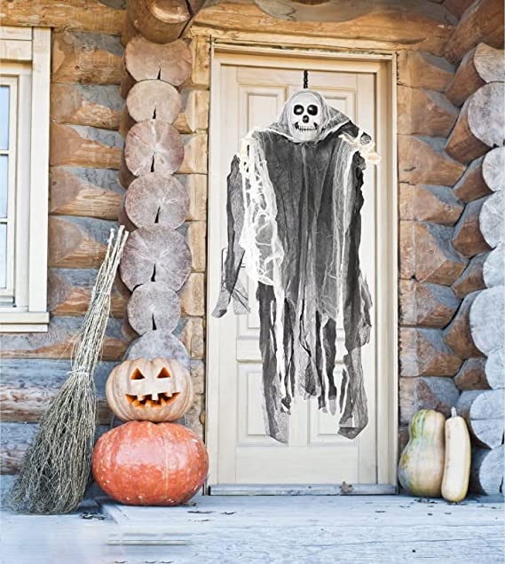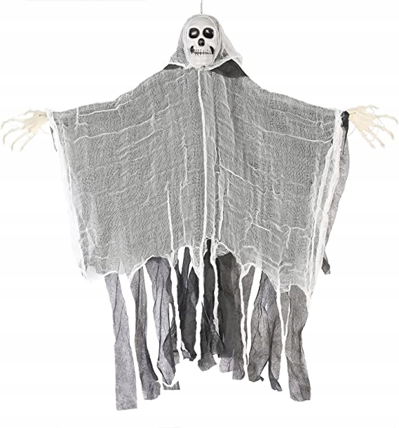 - Висящий призрак, которого можно настроить по своему усмотрению: Висячий скелет сочетается с поношенной одеждой, чтобы получить реалистичный эффект. Висящее привидение имеет гибкие ручки, которые можно гибко подогнать под нужную форму. В верхней части черепа есть веревочки, поэтому его можно повесить где угодно.
