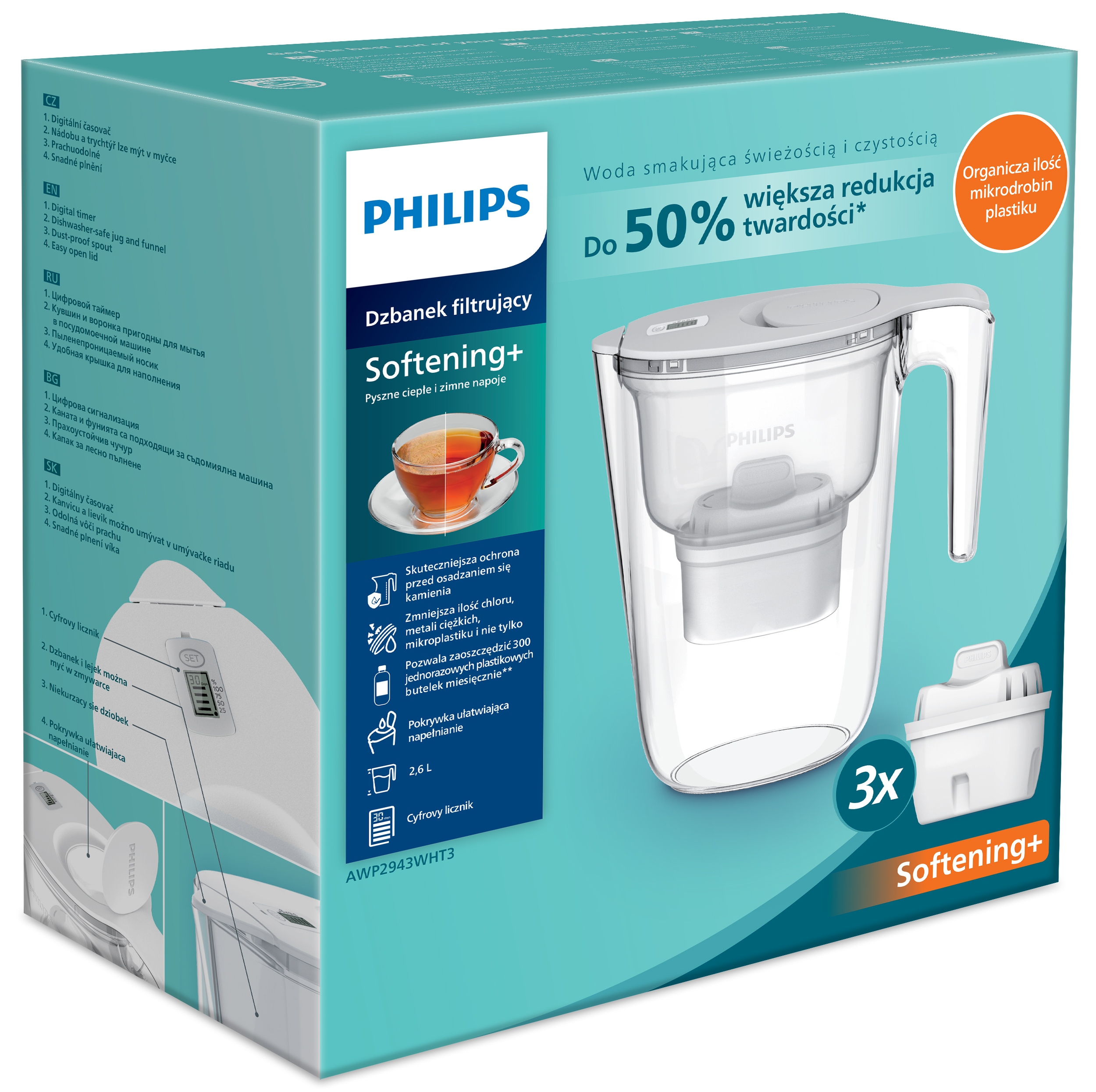 Наслаждайтесь кристально чистой водой благодаря кувшине фильтра Filips с емкостью 2,6 литров, содержащей микро-шклеанскую картридж, который уменьшает твердый пакет воды, он уменьшает хлор, камень, тяжелые металлы и новое загрязнение, такие как микропластики.
