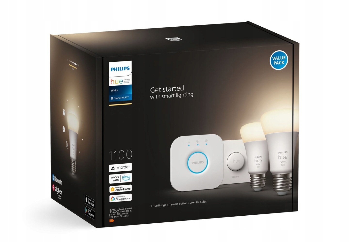 Philips HUE Белый Стартовый комплект: 2 лампы E27 1100 лм Bluetooth + Smart Button + Hue Bridge