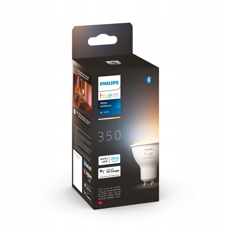 - Готов к немедленному использованию — просто вкрутите лампочку GU10 и подключитесь к бесплатному приложению Philips Hue Bluetooth для управления светом со смартфона.