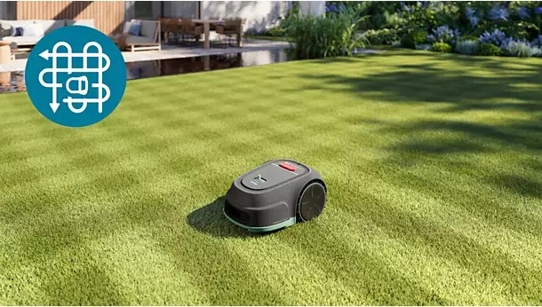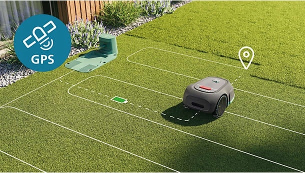 Сад отображается GPS, благодаря которому робот автоматически возвращается на базовую станцию для зарядки, и после зарядки он возвращается к последнему пункту, чтобы возобновить коси.