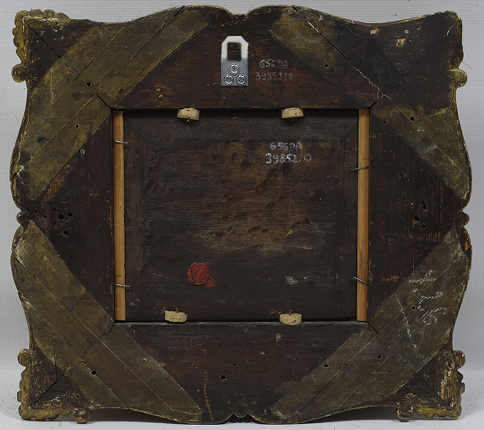 Красивая старинная картина маслом, написанная на доске, изображающая всадника перед зданием. Картина написана в стиле художника Филипса ВАУВЕРМАНА. На обороте красная сургучная печать.