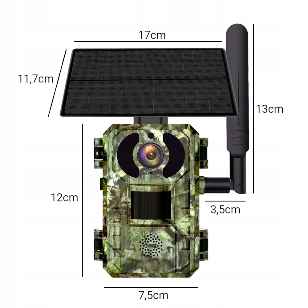 Техническая спецификация: Резолюция фото: 4MP Drying Films: 2 Kkoke Westing. 12x7.5x6cm Размеры солнечной панели: 17x11.7cm духовенство карт памяти: да (макс. 128 ГБ) Облачная функция: Takpack при температурах: -20 ℃ 70 IP65