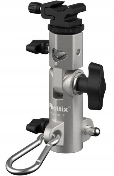 Многофункциональный монтажный держатель для многофункции Flash и Umbrella Pottix Pros Pro S является незаменимым предметом в каждой студии, как стационарной, так и мобильной. Бронированная, и в то же время легкое корпус алюминия оснащен металлической холодной ногой для репортерных вспышек и адаптеров (с нитью и 3/8 "крепления и 1/4"). Запатентованный зонт зажим защищает зонтичные стержни от повреждений и в то же время обеспечивает блокировку для большего блока до 300% по сравнению со стандартными решениями. Закрепление слезоточивых зонтиков подходит для зонтиков с палкой диаметром от 7 до 10 мм и было наклонены под углом 8 градусов, благодаря которого больше света достигает зонтика, использование аксессуаров, весом до 25 килограммов, а механизм, защищенный патентом На безопасность и комфорт работы также влияют блокады, которые удерживают нижние ручки в безопасном положении до тех пор, пока не будет выпущена кнопка блокировки. Varos Pro S имеет отверстие для повесывания с карабинером для использования с противовесом или другим аксессуаром.