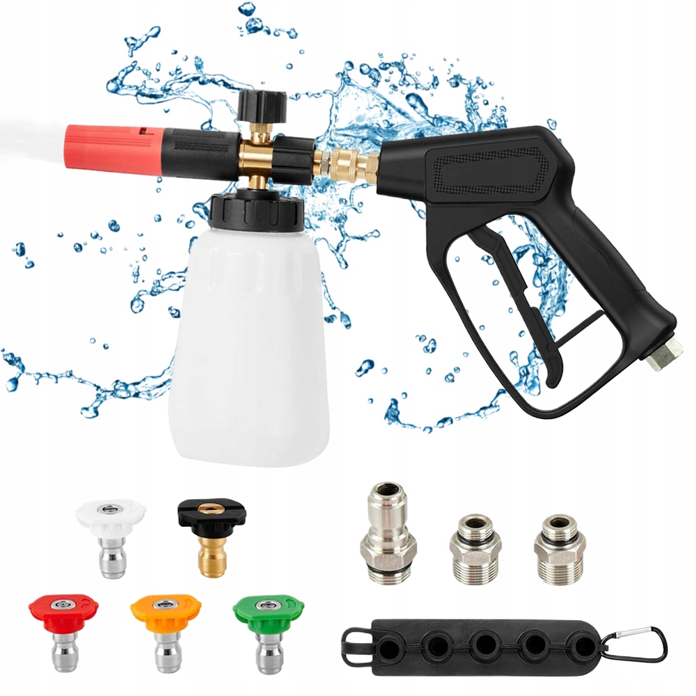 - Пистолет для пенопластовой шайбы оснащен 5 металлическими соплами с быстрым соединением (0 °/15 °/25 °/40 °/65 °), чья вода течет от сильной к деликатному распылению.